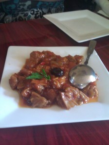 I wasn’t quick enough to photograph the baba gannush (chargrilled eggplant pureed with olive oil, lemon and garlic) before she dug in. The baba was fresh and delicious. You could taste that it was freshly prepared on site. The other appetizer – the soslu patlican (pictured to the left) – featured chopped eggplant cooked in a moderately spicy sauce of fresh tomato, green pepper, garlic, onions and parsley) was also quite fresh. Of the two I preferred the baba, but I am not a huge eggplant fan.