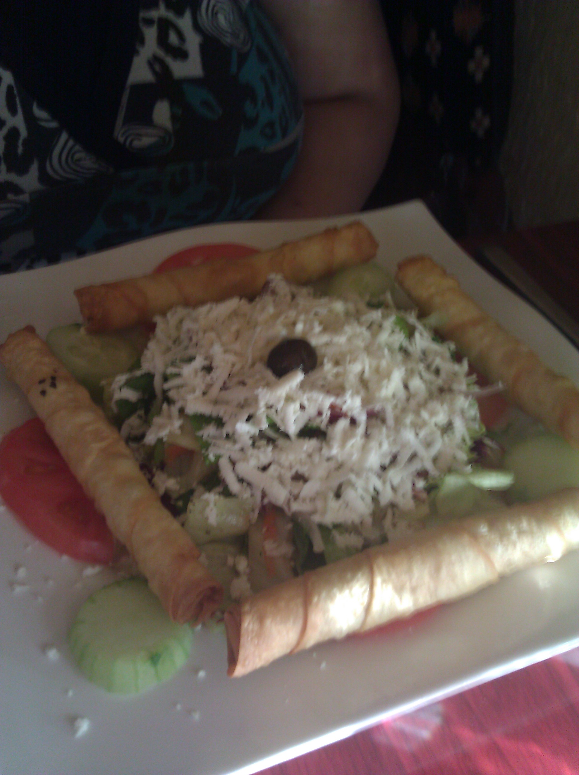 My friend ordered the Sigara Börek on Mediterranean Salad. The “cigars” filled with feta cheese and parsley were artfully placed over the bed of greens, and she loved her choice.