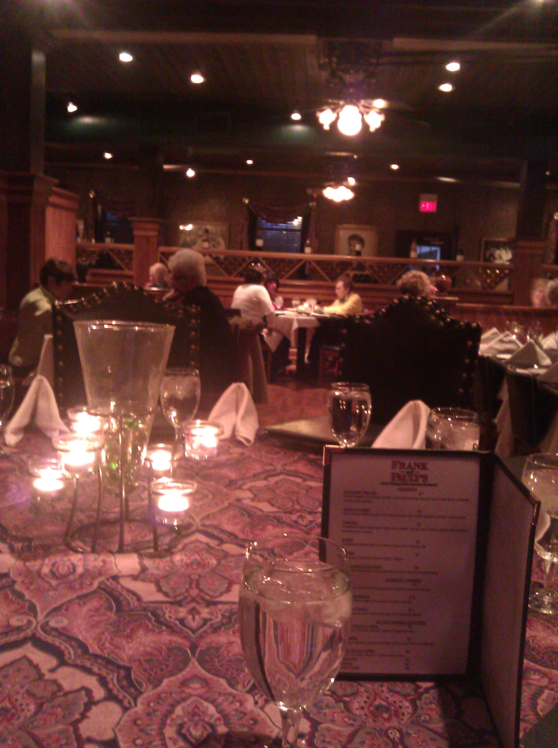 The service at Frank & Pauly’s was impeccable. Our waitress was very attentive and had no problems with separate checks for our table of ten. The timing of the food was perfect, and she even waited to put our entree orders in to allow one of our latecomers to eat with the group (we had just finished ordering when she arrived). Our water glasses were topped up several times, and everyone was very friendly. I can’t wait to go back to this little gem in Lake County. It is well worth the drive! Everyone at my table agreed.