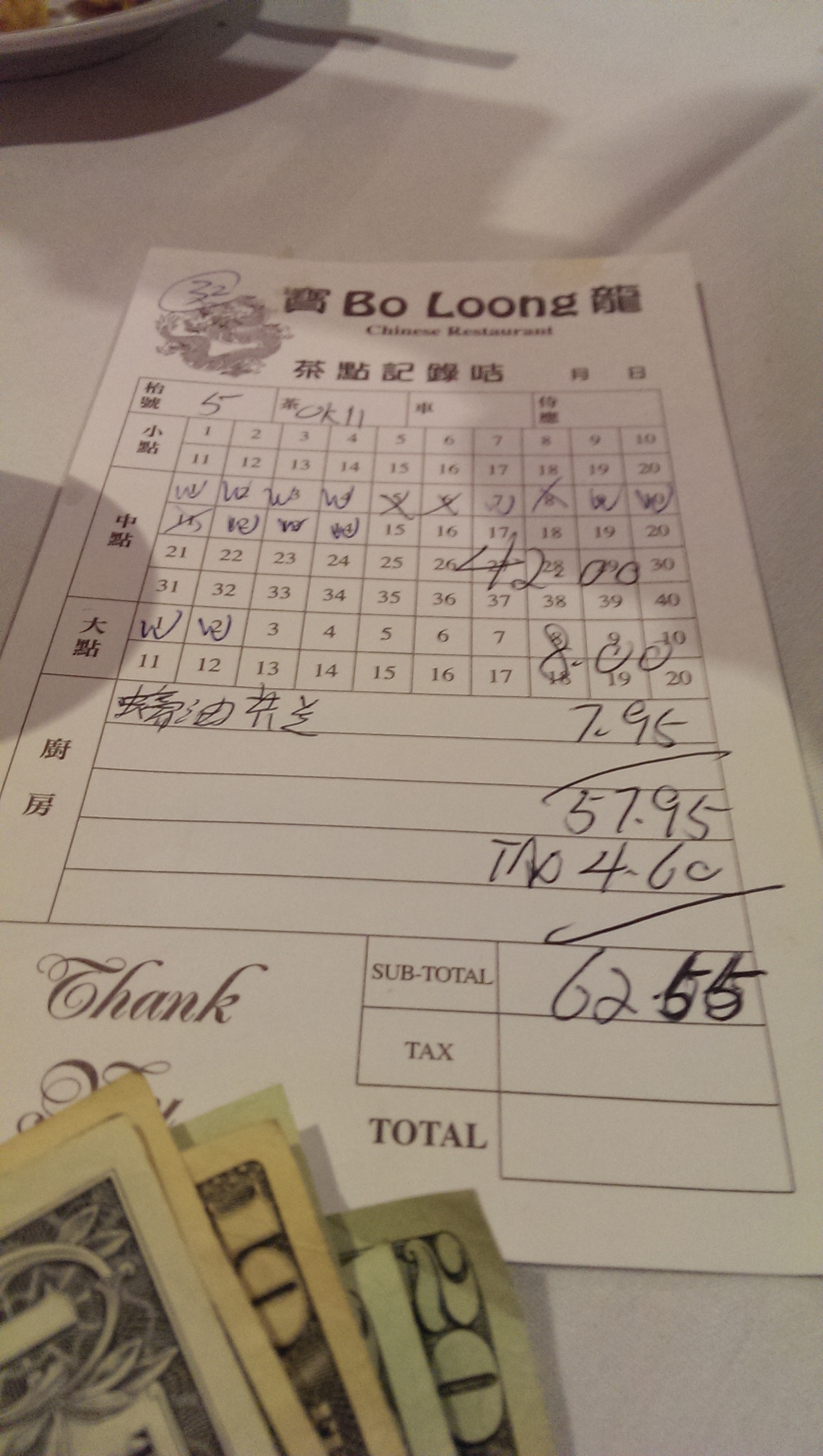 Dim sum is served in most Chinese restaurants on carts. The fully cooked and ready-to-serve dim sum dishes are wheeled around the restaurant for customers to choose their orders while seated at their tables. The most unusual dishes can be ordered from the servers and are made to order in the kitchen. The dishes are tallied on a bill that is left on the table, and are priced according to size. The recent cost of dim sum at Bo Loong for 8 people was $62.55, which came out to about $10 a person after tax and a generous tip.