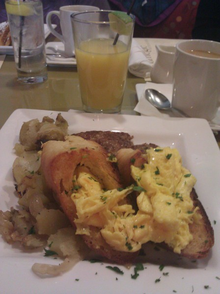 eggs that morning. I just wasn’t in the mood for a runny egg that day. The scrambled eggs were artfully placed in the brioche, making it a thing of beauty, and I enjoyed it very much.
