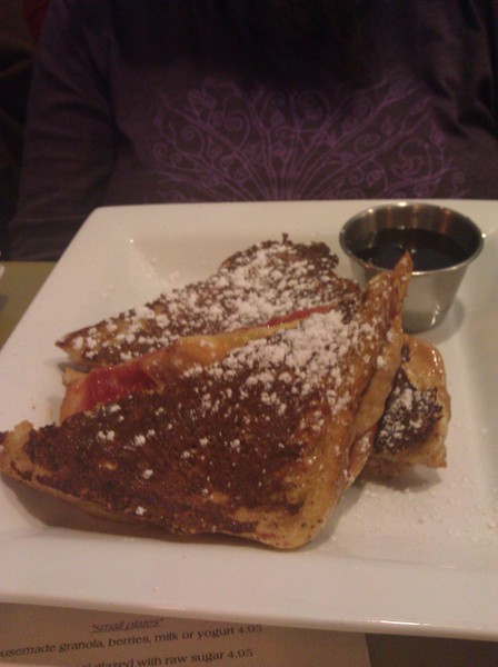 I was able to try my friend M.’s peanut butter, jelly and banana French toast featuring raspberry preserves. Wow! It was sweet and savory, and a very memorable combination. It was essentially peanut butter, raspberry preserves and banana sandwiched between pieces of bread and lightly fried to a golden brown. It was served with a side of syrup.