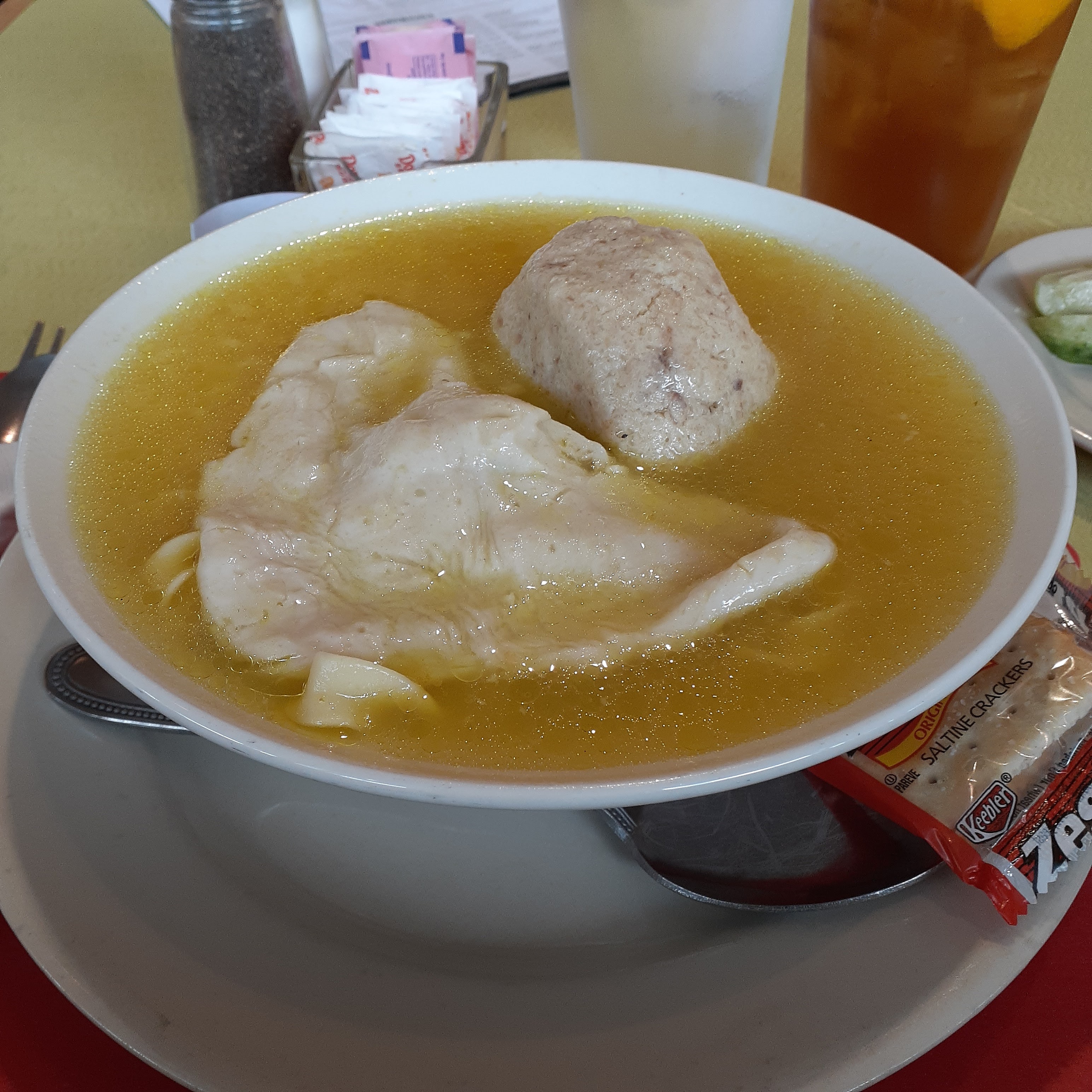 Jack’s may not have a lunch counter, but it has its devoted regulars and features the best soup in my opinion! The flavor of their chicken soup broth is just a bit deeper and richer. Their version of The Mish Mash is called The Whole Magilla and, like Corky & Lenny’s, features a matzoh ball, kreplach, noodles, rice – all served in an extra large bowl. I’ve ordered it to go several times and they give me a quart container brimming with goodness.