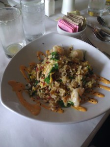 you prefer a heartier meal I recommend trying the burger or the shrimp fried rice. The shrimp fried rice is made with shiitakes, leeks, scallions, bacon, spinach and scrambled egg with chile aioli. The chile aioli is bright and will definitely wake you up!