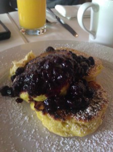almond-stuffed french toast (featuring local strawberries, toasted almonds and local maple syrup), lemon souffle pancakes topped with blueberry compote, and the house cured salmon plate. The lemon pancakes (pictured to the left) are light and not as heavy as they look in the photo. The blueberry compote is absolutely delicious. If I could have ordered a bowl of that alone I would have.