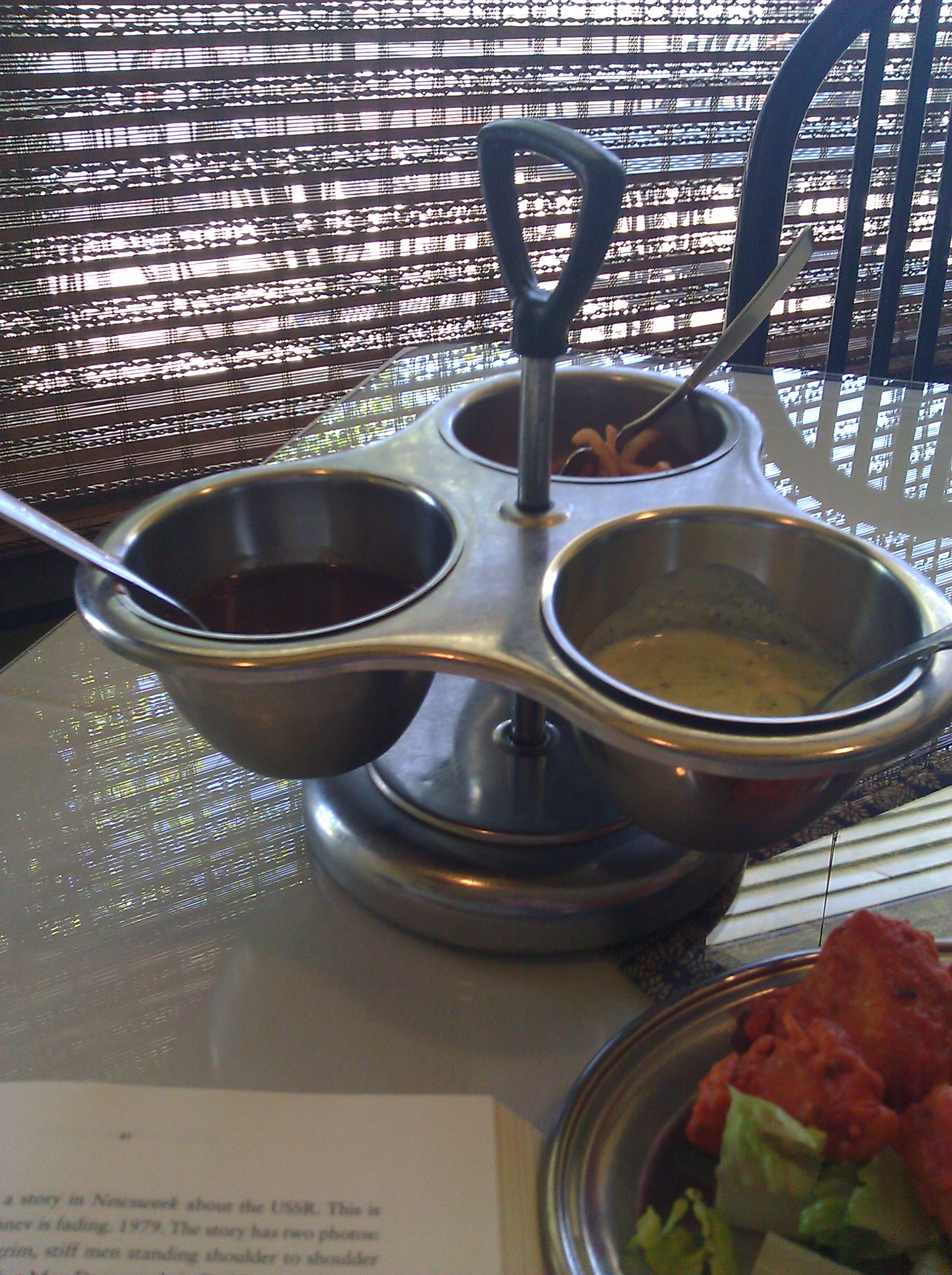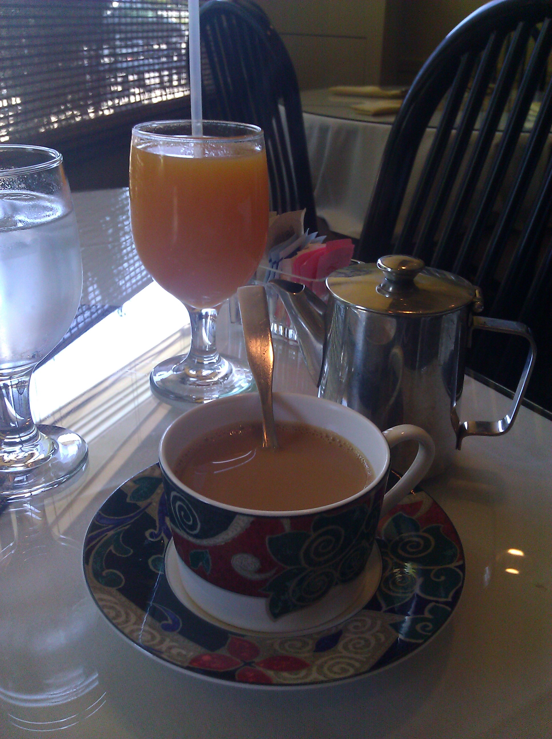 I ordered a mango juice and a chai (Masala tea). The mango juice was refreshing and was a nice palate cleanser. I was less enthused about the chai. My best friend’s mother makes a delicious, well-seasoned chai with black tea and Indian spices such as cardamom. This one was sadly lacking in any kind of flavor, and the addition of sugar did not help it much.