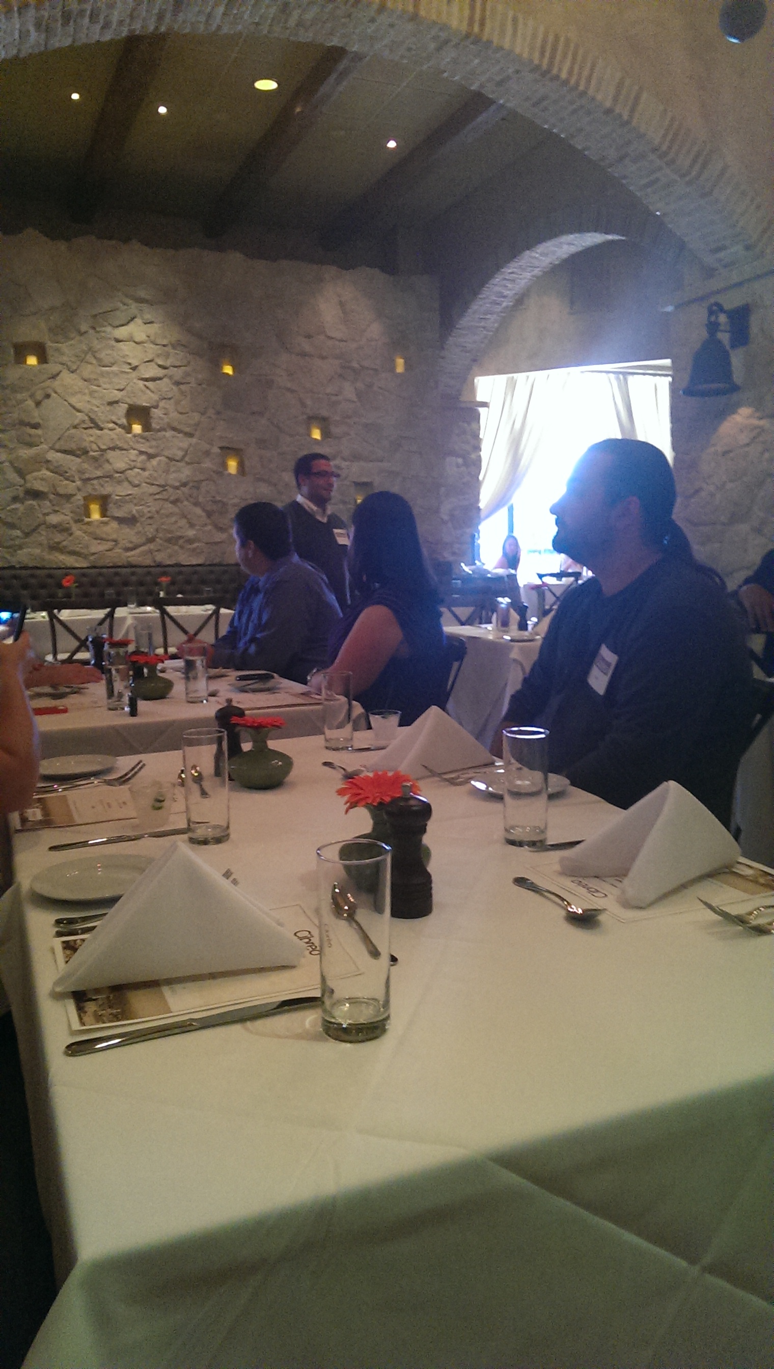 A fire was roaring in the corner, and there were flickering (flameless) candles in recesses inside a massive sandstone wall on the north side of the room. I particularly loved that feature. The new location seats 200 people, with private rooms that can seat up to 125. We were welcomed with a small feature cocktail,