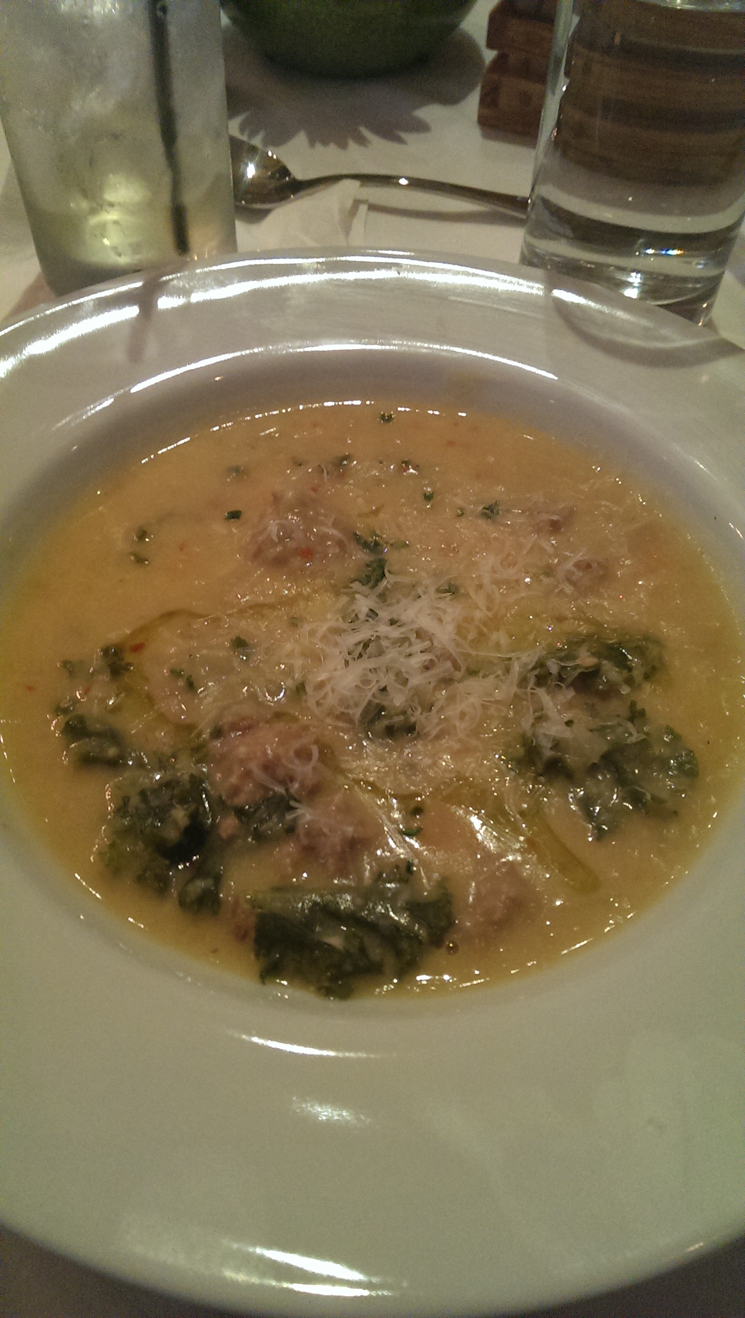 The first course was sausage, porcini mushroom and bean soup. It was delicious. It was somewhat spicy and made me appreciate the sausage, mushroom, beans and kale of it all. I could see trying to recreate something like this at home – very simple and fresh ingredients.