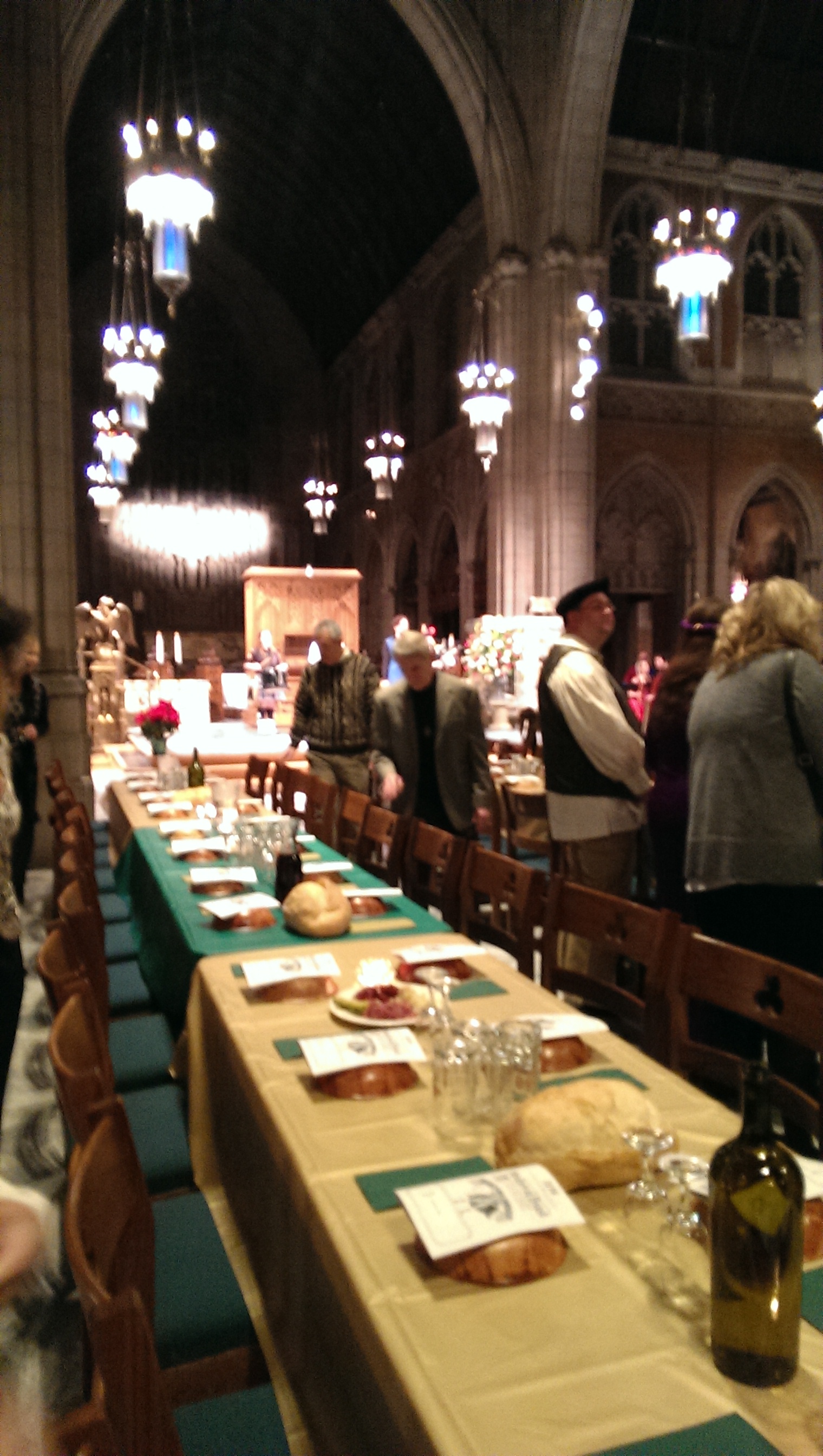 We walked into the Cathedral in a procession of bagpipes. I love the Cathedral, so I can’t imagine a more lovely venue to have a meal. We quickly found our seats at our assigned table and tucked into the pickled beets, cauliflower, onions and cucumbers as well as loaves of bread from Breadsmith. Dinner was unfortunately not served on trenchers of bread, but rather in salad bowls. We ate with our hands. Luckily I was aware of this ahead of time and brought the hand sanitizer.