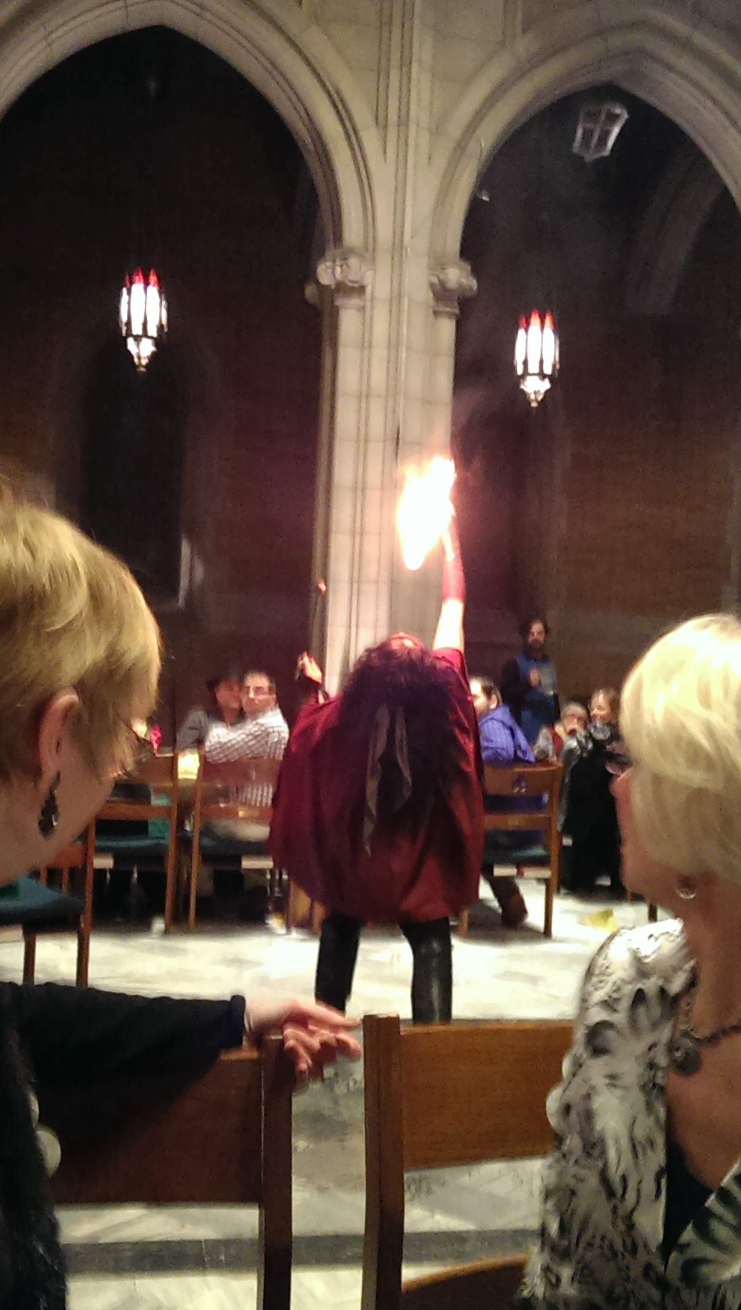 Doors opened at 7 PM, and the Cathedral opened for dinner at 8 PM. The foyer hosted mulled cider and hot apple cider as well as a table of cheese and crackers. By the time I arrived the cheese and crackers were pretty much decimated. Service of the courses was slow (it’s hard to feed 300 people at once), so we didn’t leave until almost 11. I can’t imagine how late they were there breaking down the tables and preparing for the Sunday service the next morning.