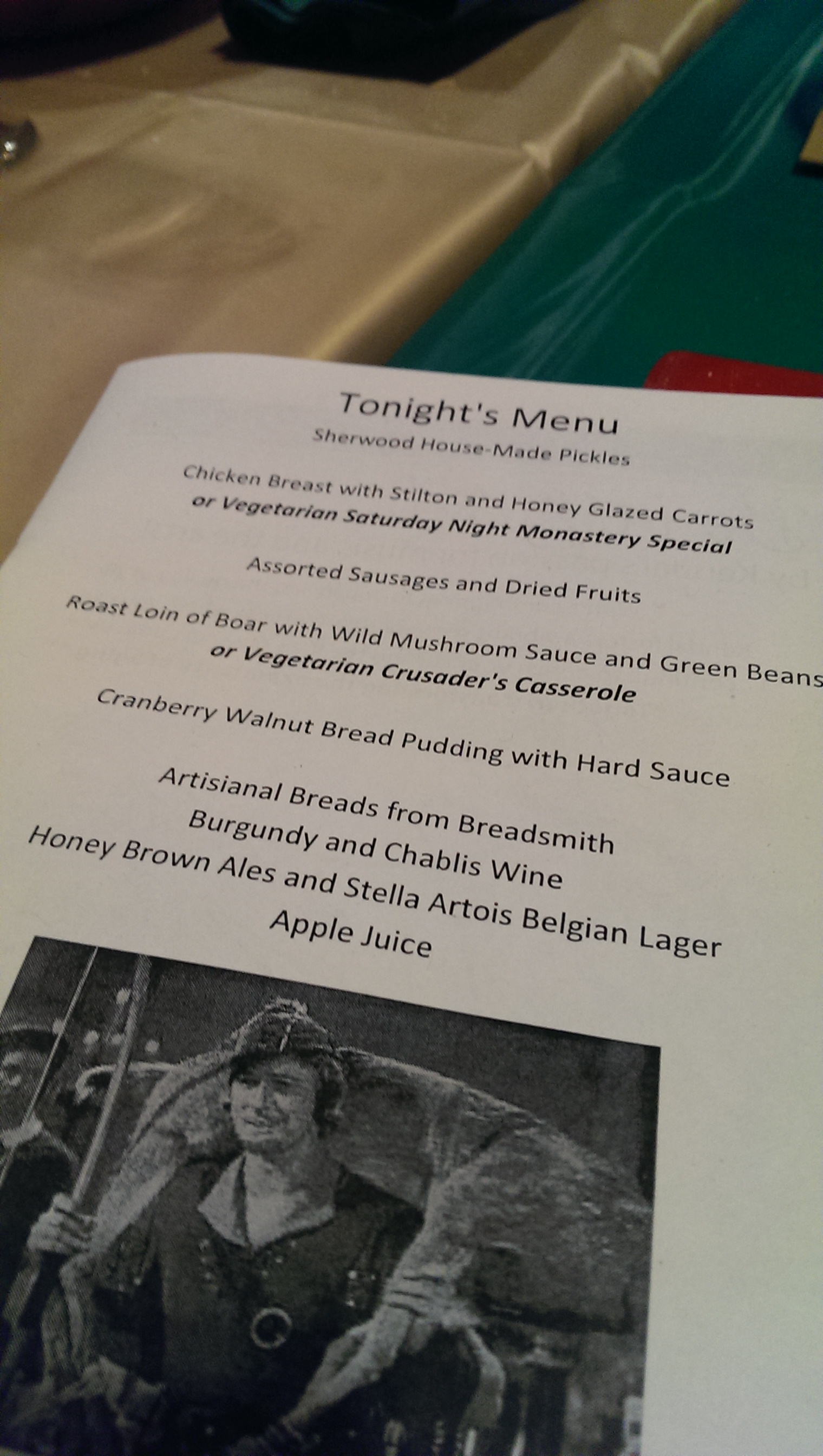 They offered entertainment to keep us occupied during the breaks between courses. In addition to fencers and jugglers, they had actors portraying the Sheriff of Nottingham, Robin Hood, Friar Tuck and Maid Marion, which carried on throughout the evening. They had tucked away playtime coins under the bowls that we were to give to Robin Hood or his henchmen when they came by. They had a group of madrigal singers, which were quite talented. Todd Wilson played the organ for a sing-a-long. And last but not least they had a fire breather for entertainment as well. It was definitely an experience that should not be missed – and the money goes to a good cause! The funds raised from the Feast allow Music and Art to produce its free Brownbag Concert series, which are every Wednesday at noon and is a great lunch break. Tickets for the Feast go on sale in mid-December here.
