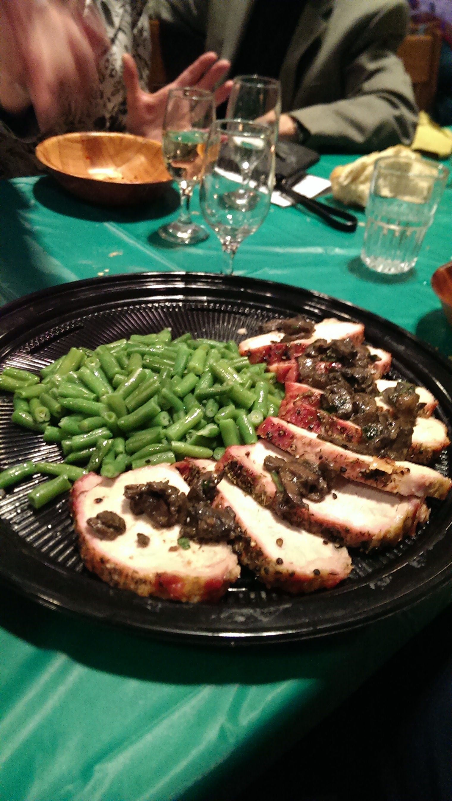 The first course was chicken breasts stuffed with Stilton cheese and honey glazed carrots. We sat with the guy who had stuffed the chicken breasts, so it was fun hearing some behind-the-scenes-prep stories. The chicken was amazing. They were lightly breaded, and the Stilton was an excellent pairing. The honey glazed carrots were also delicious. I hadn’t yet found my groove for photographing the food, and had trouble photographing this course.
