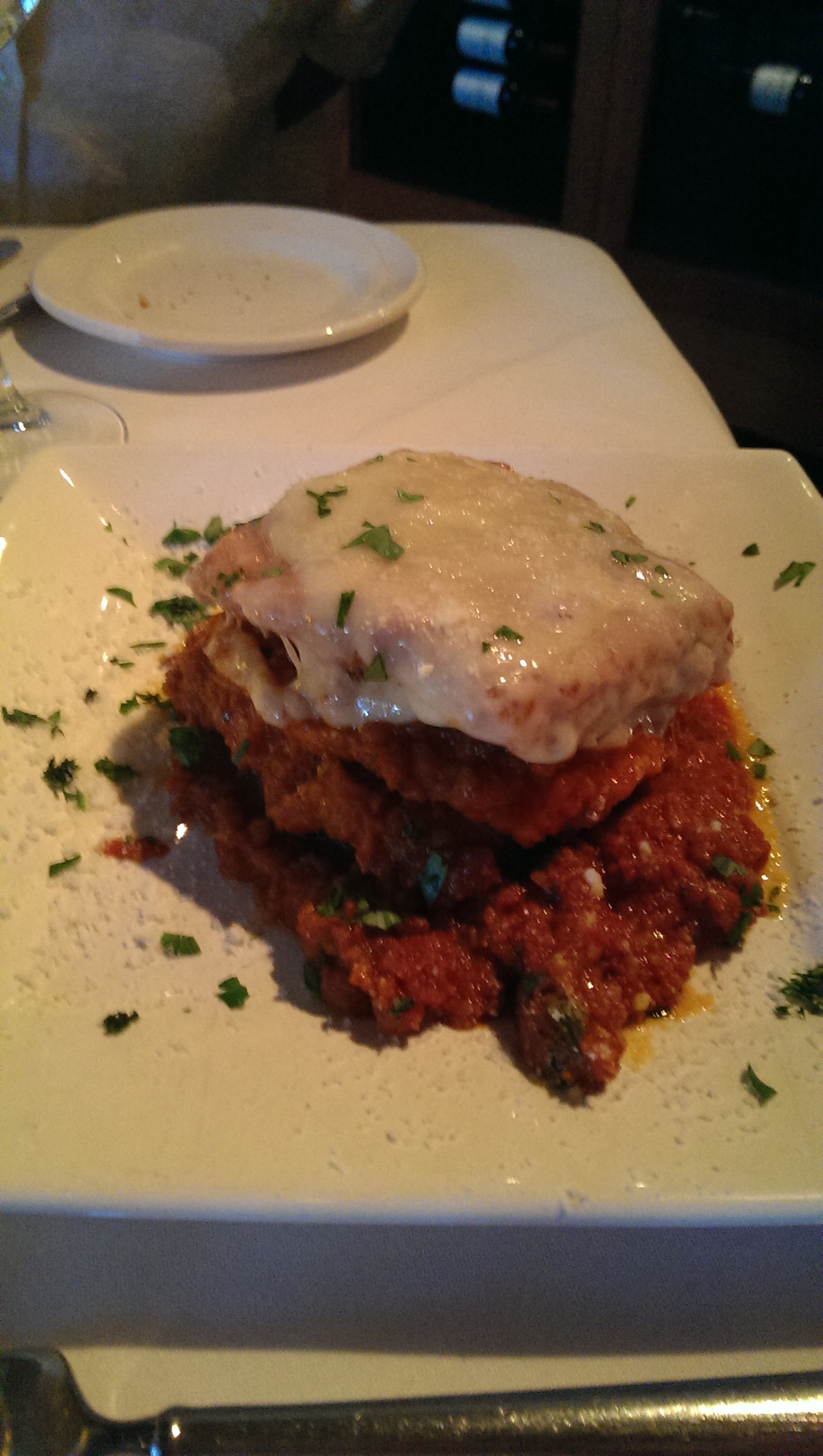 The starters are divine. On a recent trip my friend ordered the layered eggplant terrine (Terrina di Melanzane), and it