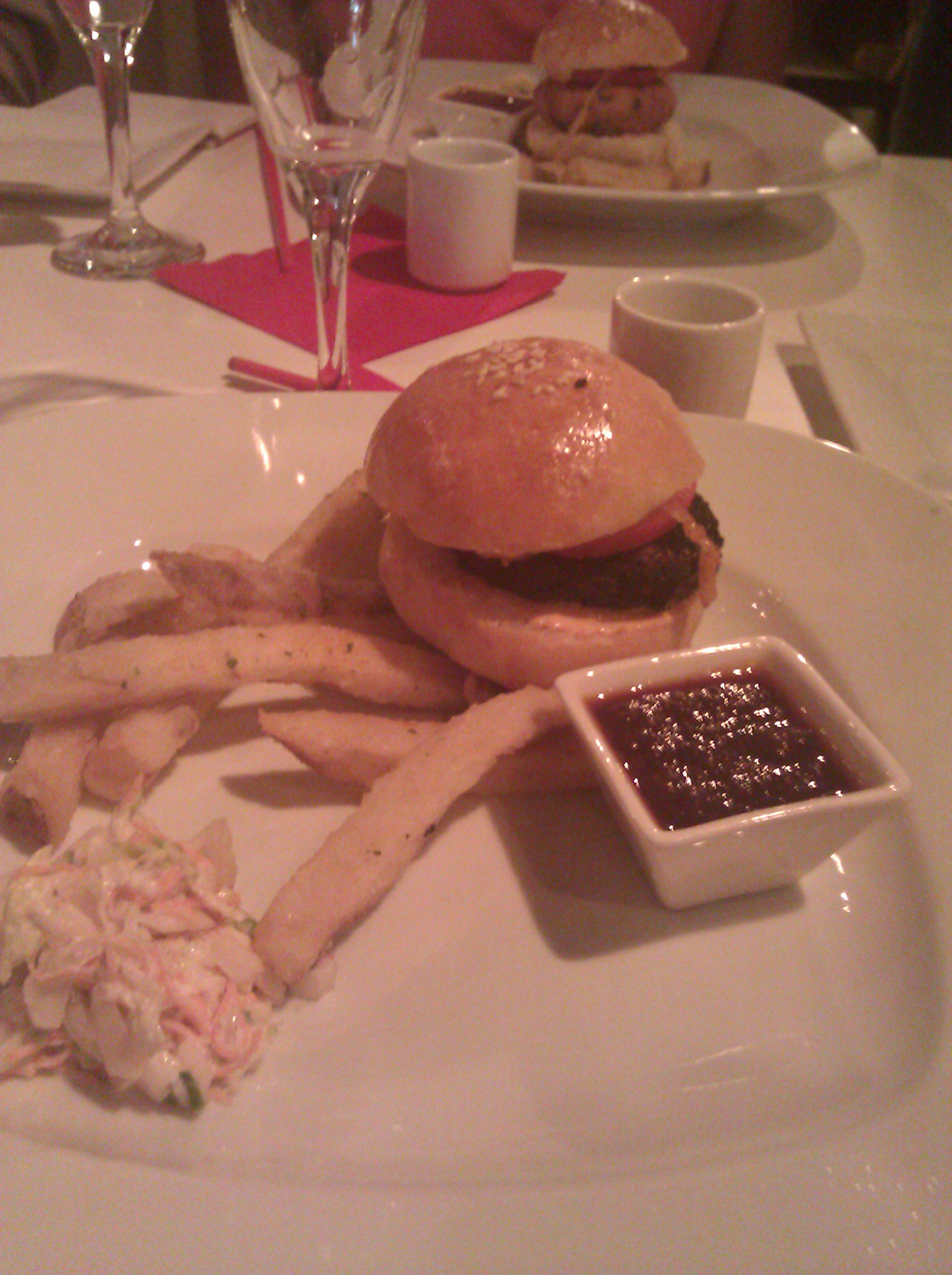 Chef Kim came out and greeted us at SASA with sparkling Niogri sake. The sake was refreshing, and in a fun twist of fate one of the women with whom I was sitting was married to the sake distributor, so I got to learn more about sake than was presented. We also were treated to a second glass of sake (the little white cups in photo of lamb slider) The sake paired well with SASA’s lamb sliders and unbelievably addictive SASA fries. The lamb sliders (or “mini burgers”) were served on homemade sesame buns. They were the perfect two-bite course. And I have waxed about the SASA fries before.