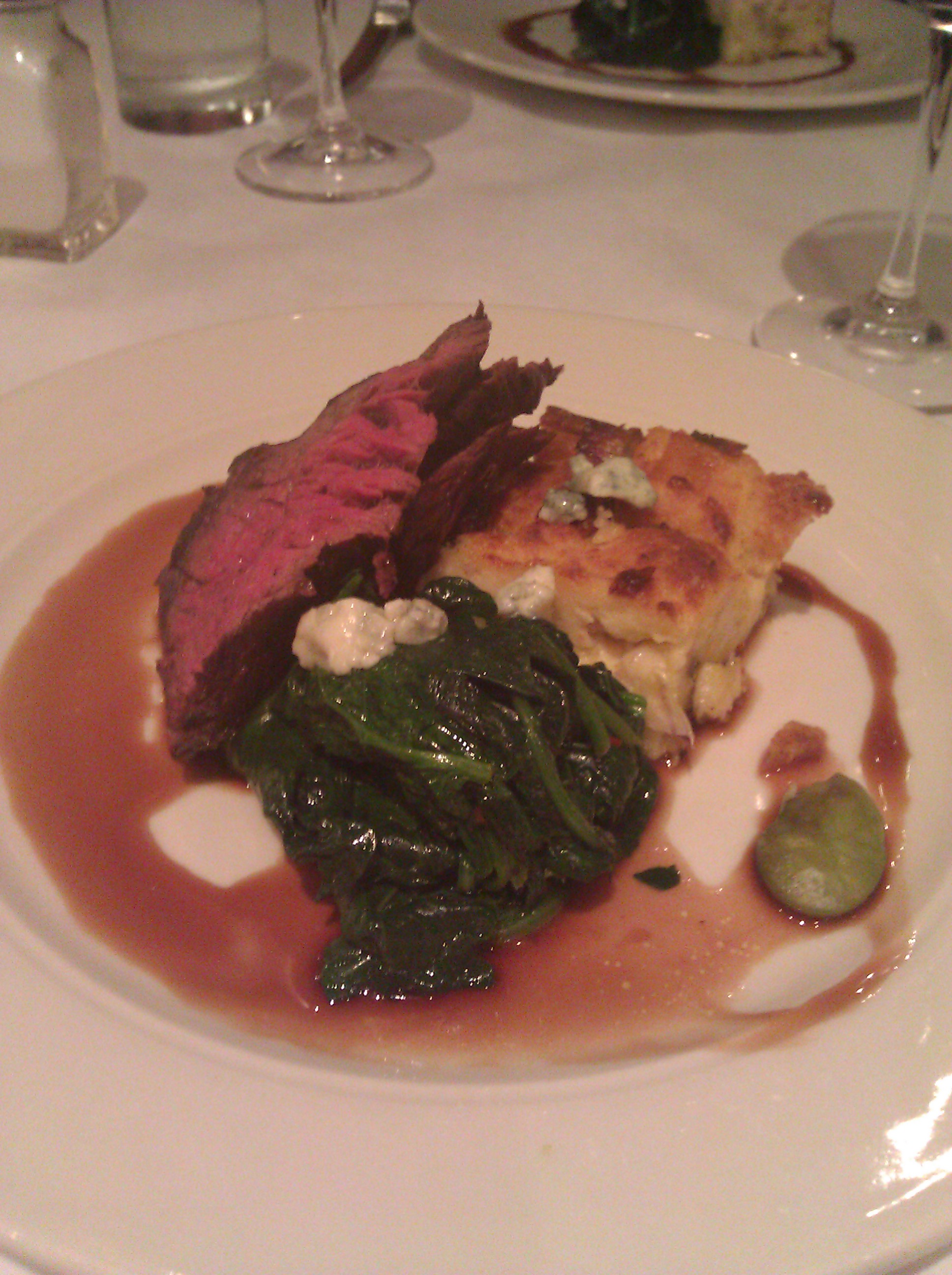 The next stop on the tour was Fire, Food, and Drink. We were seated in their private room and greeted by Chef Katz. We were given our choice of red or white wine and served 4 ounces of Fire’s Tandoor roasted hanger steak with leek bread pudding, crumbled bleu cheese, sauteed spinach and porcino jus. This was by far my most favorite course. It was extremely delicious. I was starting to hit the wall here, but thoroughly enjoyed the few bites of steak I could manage to eat. The leek bread pudding and sauteed spinach were also absolutely divine!