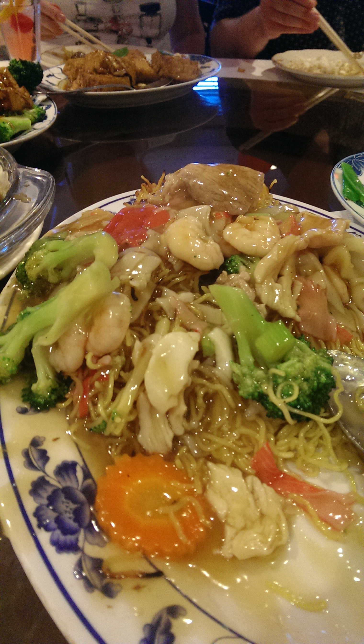 The pan-fried noodles with meat and seafood was a HUGE portion. The noodles seem to be some sort of ramen noodle. They were crispy on the edges and deliciously soft where it soaked up the sauce. It also had lots of fresh vegetables. As you can see on the right, we barely made a dent in it.