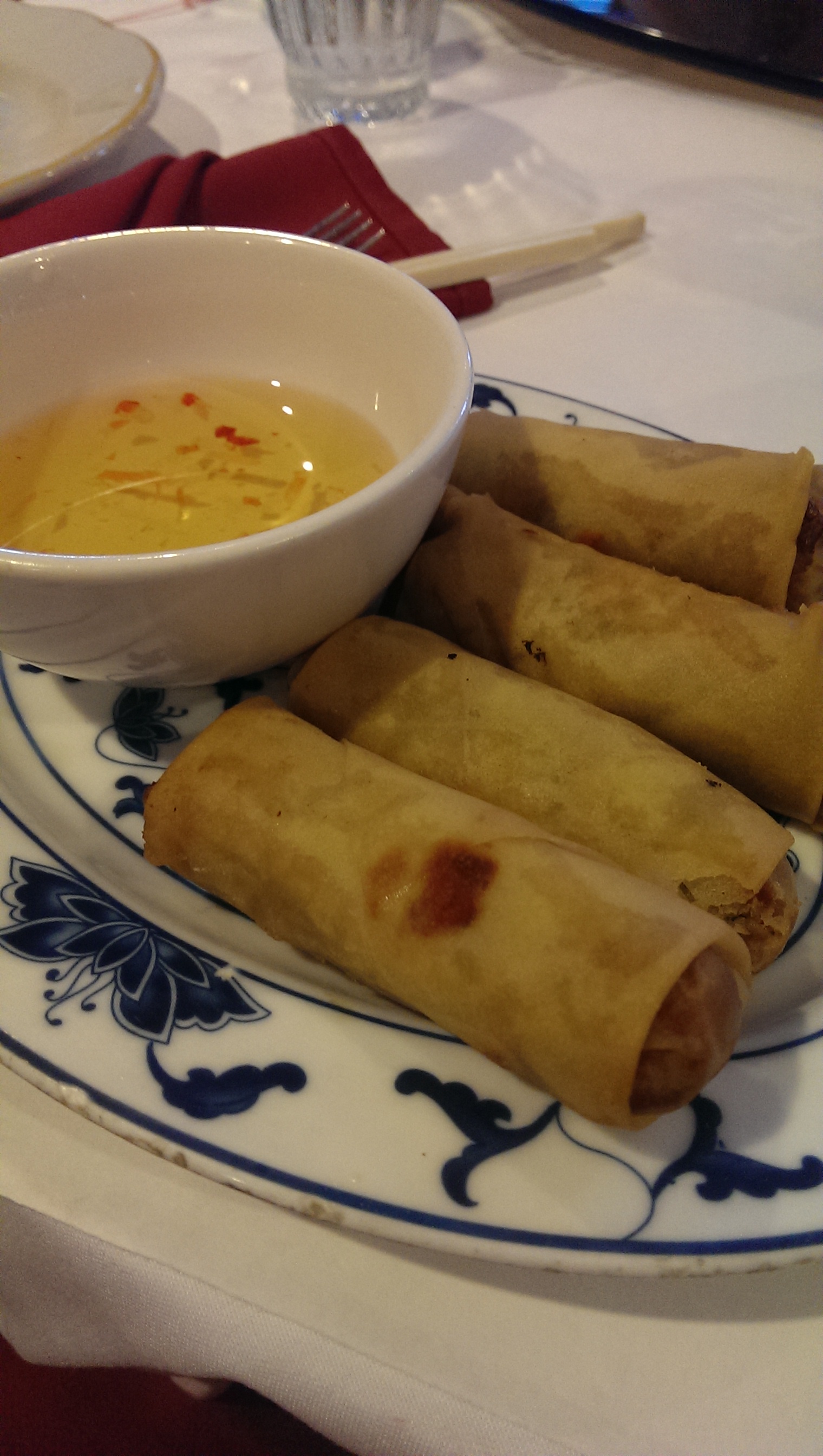 I started my meal off with an order of the Siam Wings, which are marinated boneless chicken wings stuffed with a “house filling” and and then deep fried. They are known for their wings. The house filling is apparently dumpling innards (a savory mix of pork, veggies and vermicelli). Dipped in a sweet/sour