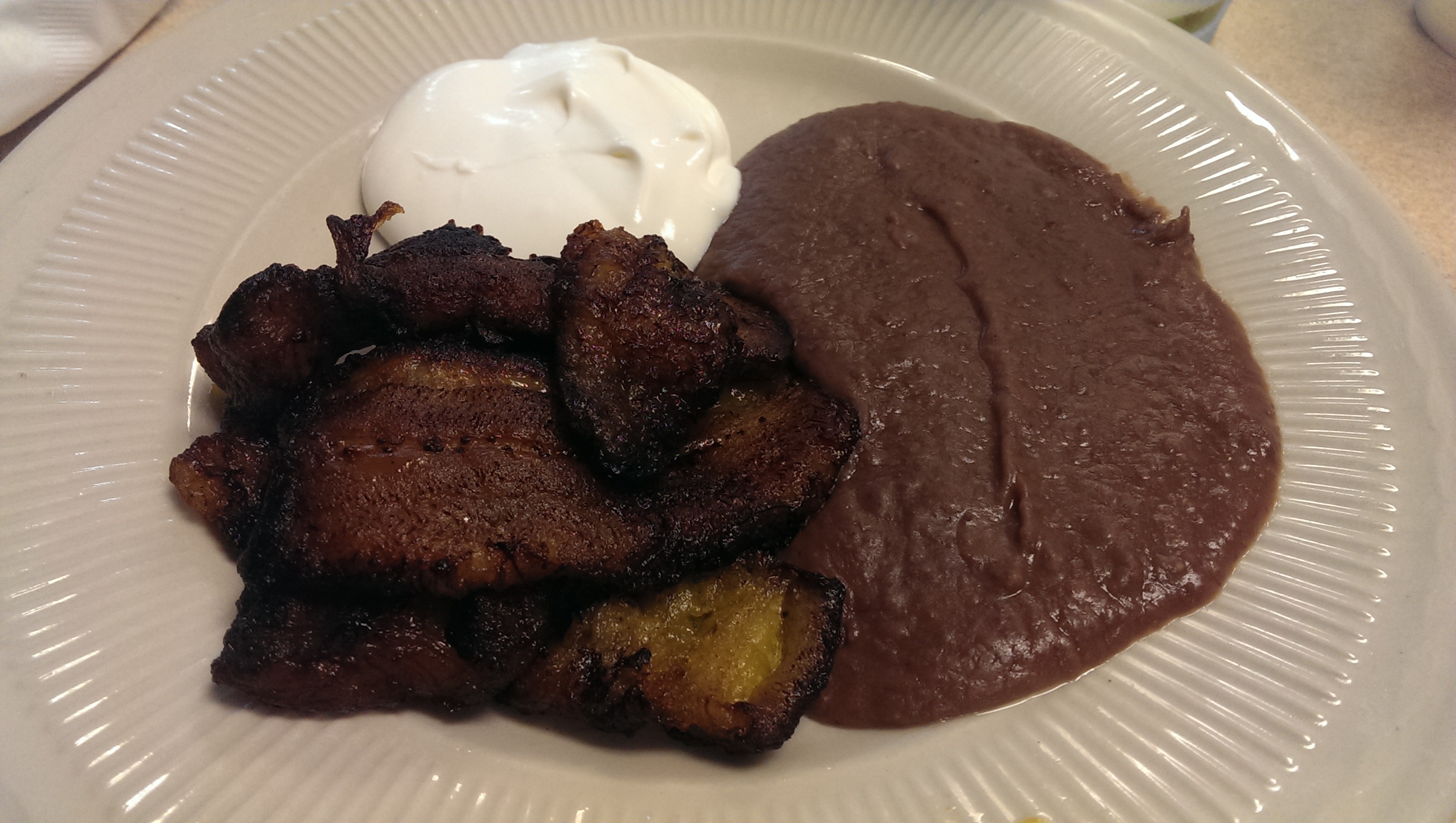 I ordered two pupusas – one revuelta (pork and beans) and one pollo con queso (chicken and cheese) – and an order of fried plantains, which came with refried beans and sour cream. I preferred the revuelta over the chicken, but they were both good. They were even better paired with a forkful of beans and sour cream along with the slaw and hot sauce that come with