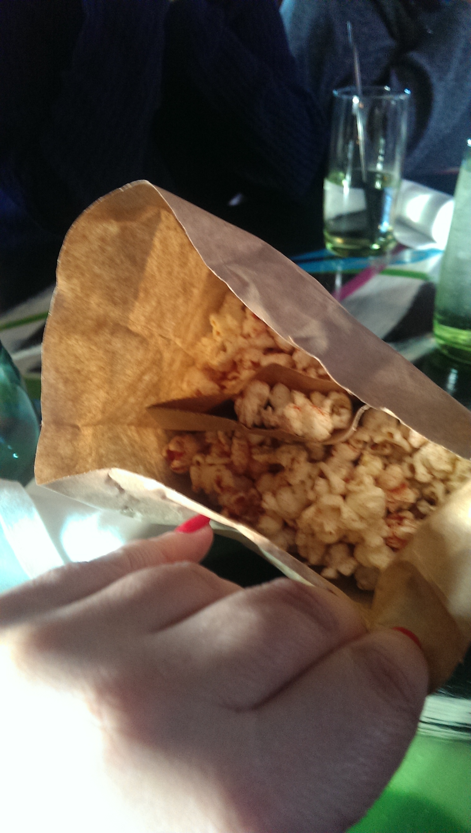 Instead of bread they serve paper bags of flavored popcorn. The flavor varies every day. The day we were there it was a tomatillo popcorn. Another day I was there it was jalapeno cheddar. It is a fun and unique item, and makes you really thirsty. Hats off to that idea.