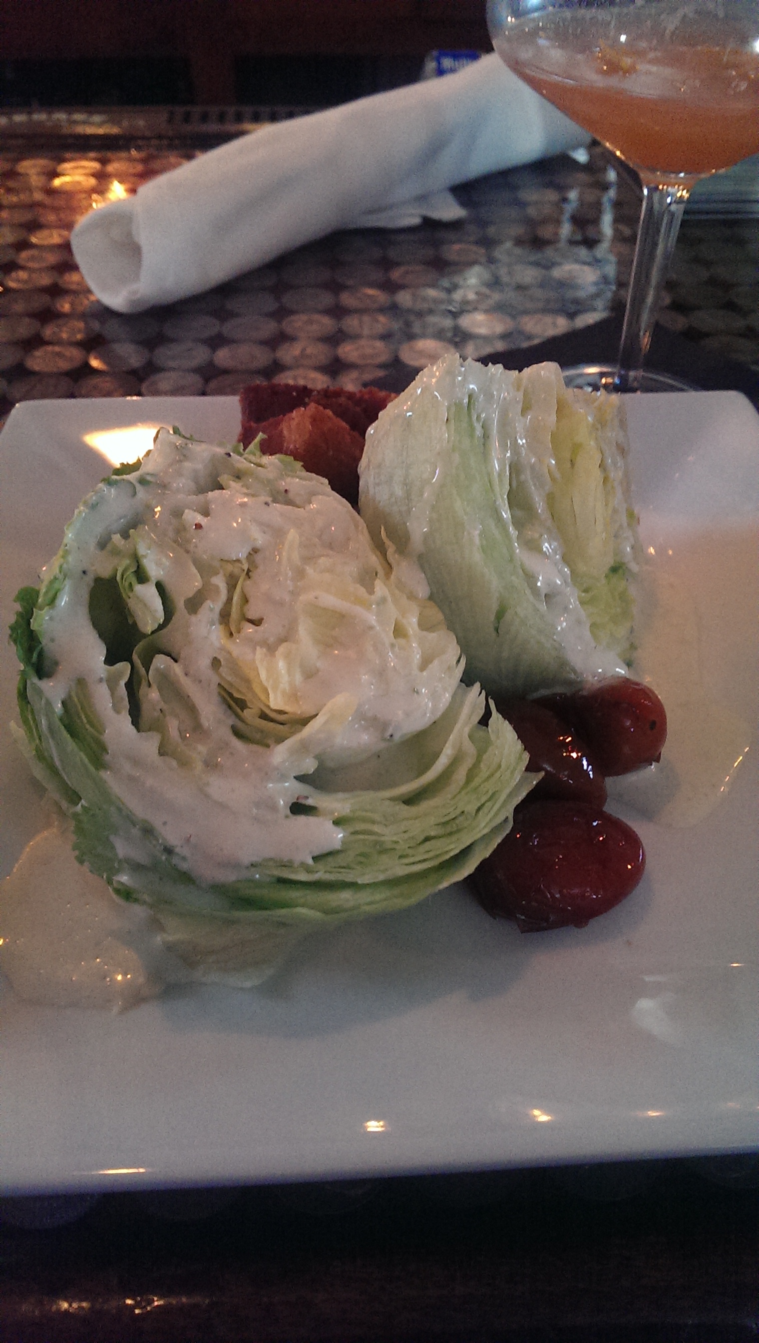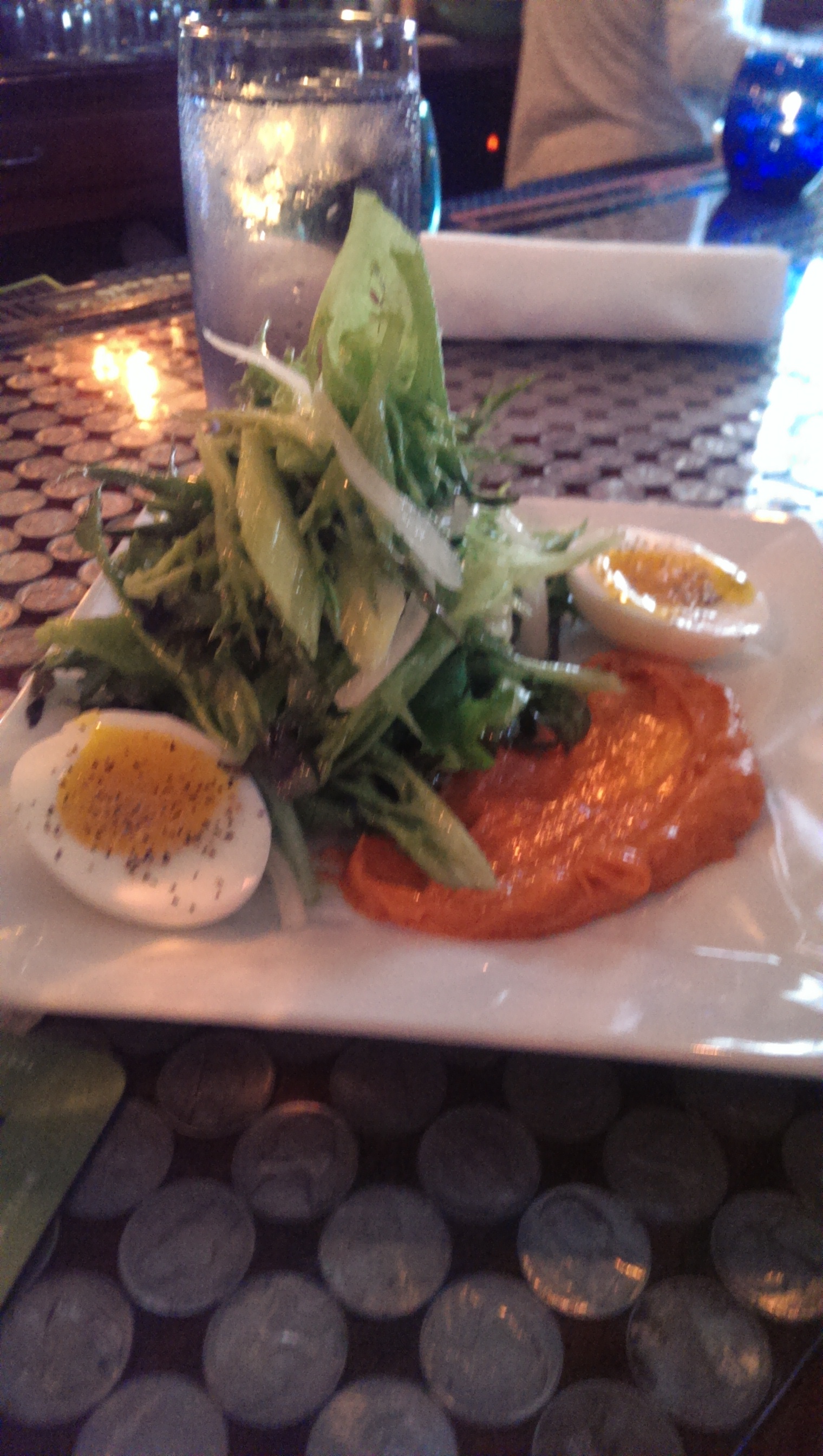 The next time I went I was in the mood for something light, so I ordered the BLT Salad (left). It features iceberg lettuce wedges served with crispy pork belly, balsamic roasted tomatoes, bleu cheese crema, and a delicious buttermilk vinaigrette. The bleu cheese and buttermilk melded together to make a delicious dressing. I enjoyed this salad a lot. My friend ordered the Egg Salad (right) and was just as impressed with it.