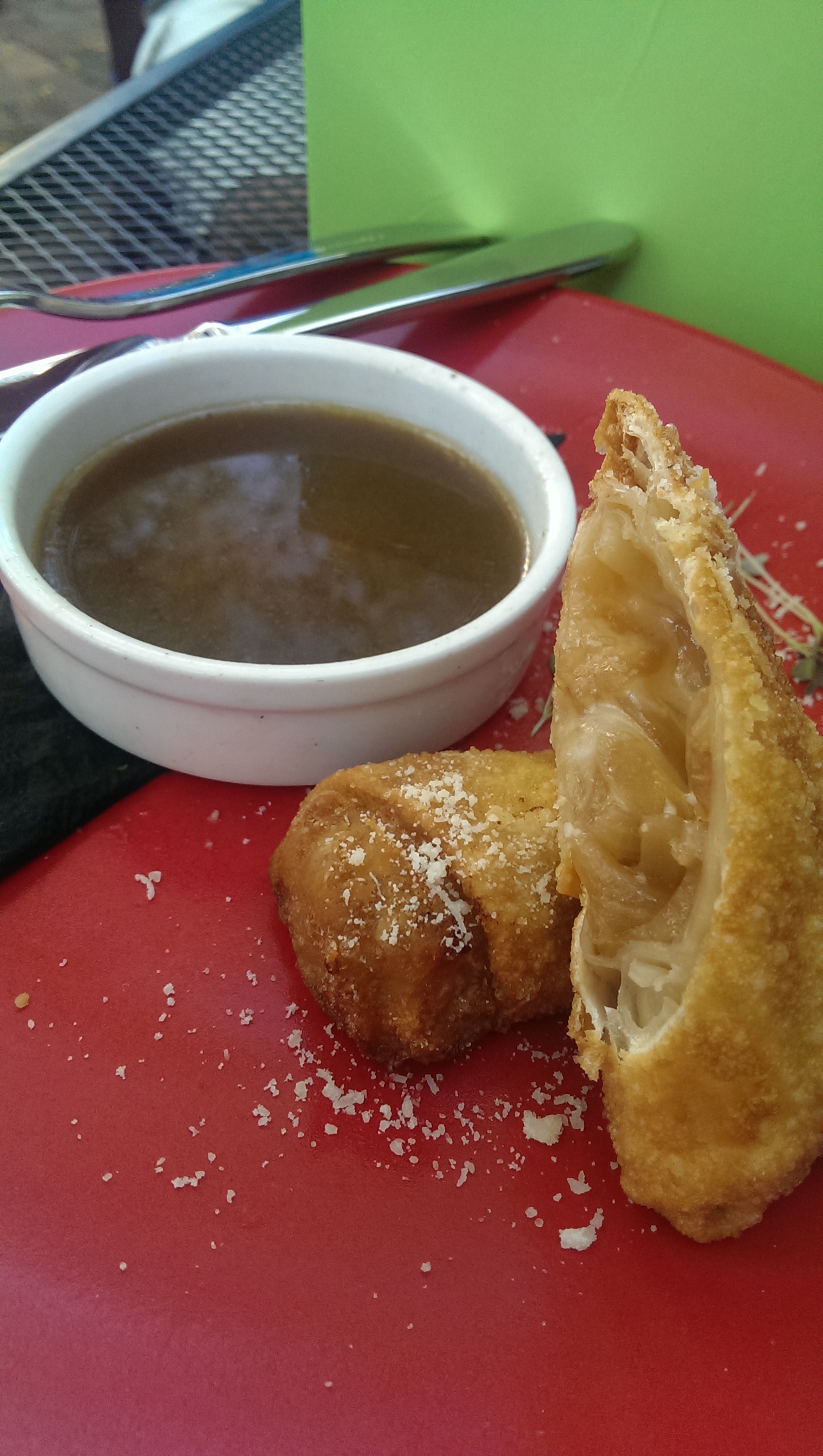 The French Onion Egg Rolls taste exactly how you think they would, like French onion soup and delicious. The crispy wonton wrappers are packed with caramelized onions and Gruyere cheese and it is served with a French onion jus to dip the egg rolls in. Again, this unique twist really worked for me.