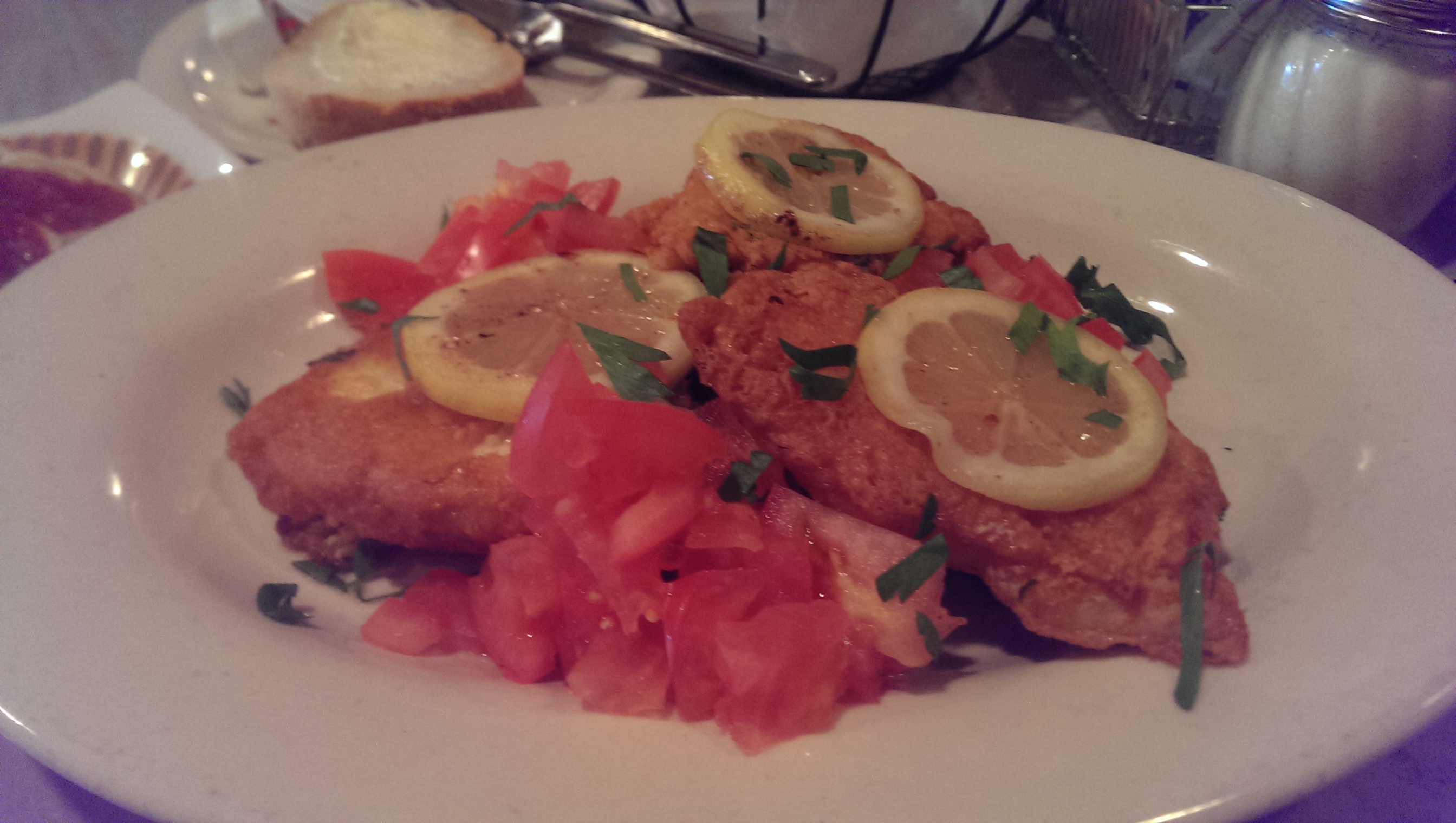 Geraci’s also offer veal and chicken entrees. The Chicken a la Tosca was out of this world. I wasn’t expecting such a large portion. It came with three chicken cutlets dipped in egg batter and lightly fried and served over a bed of garlic spinach and diced tomatoes. The chicken was really moist and tender.