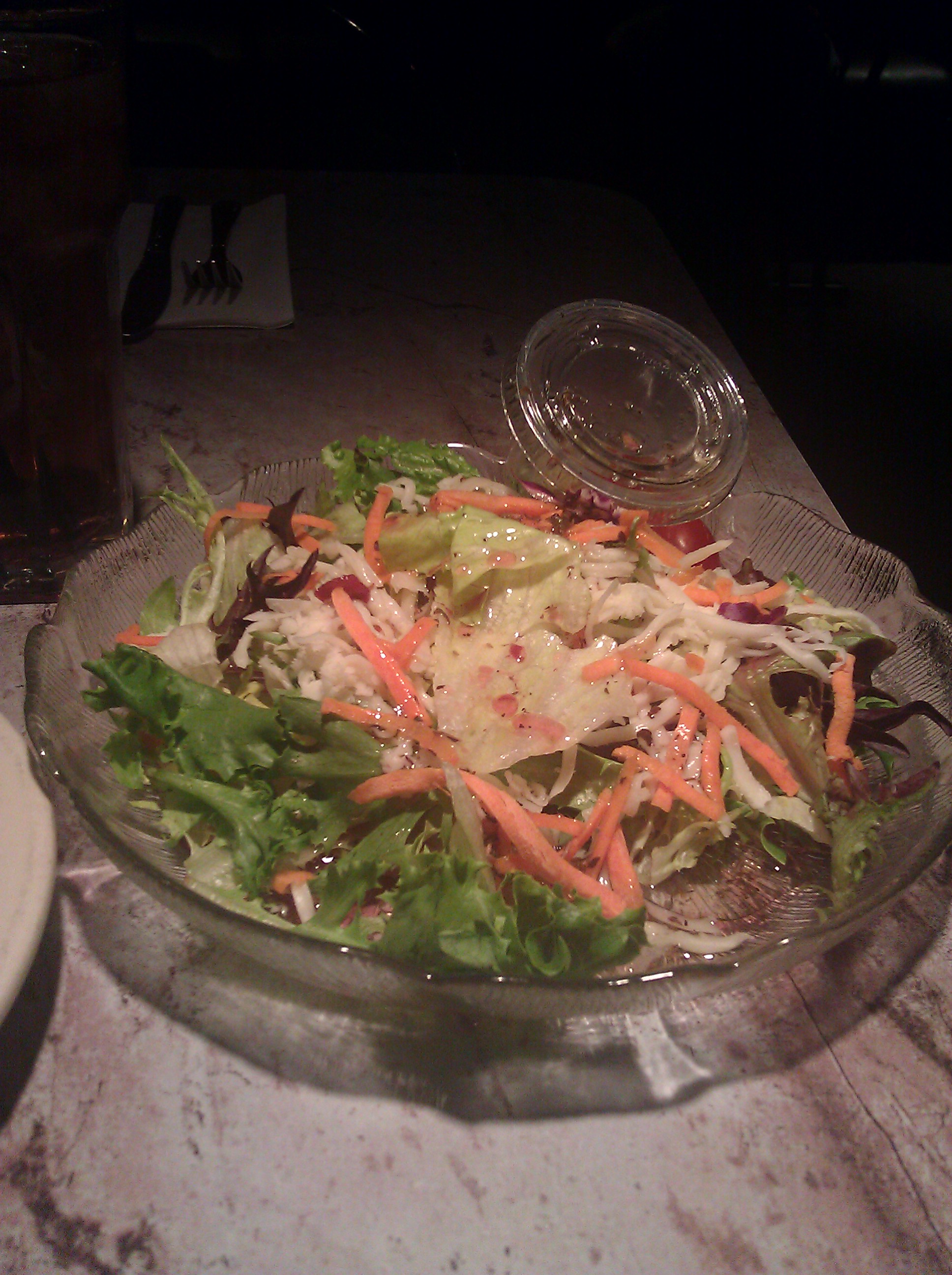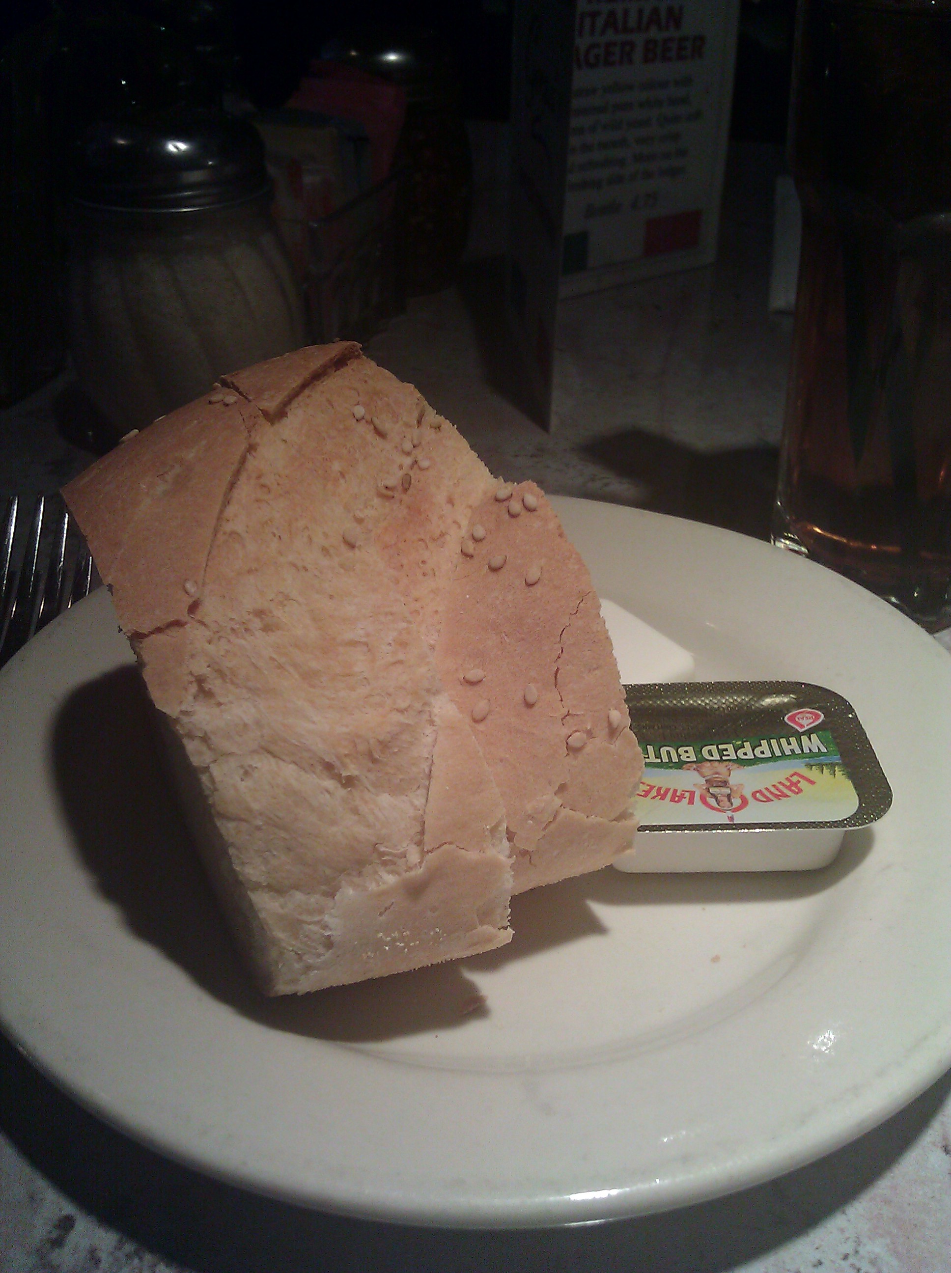 The bread service features crusty and soft Italian bread with a dusting of sesame seeds on the crust and packets of soft butter. The House salad dressing is a good choice if you like red wine vinegar. It’s pretty overwhelming. You can order it with and without grated mozzarella on it.
