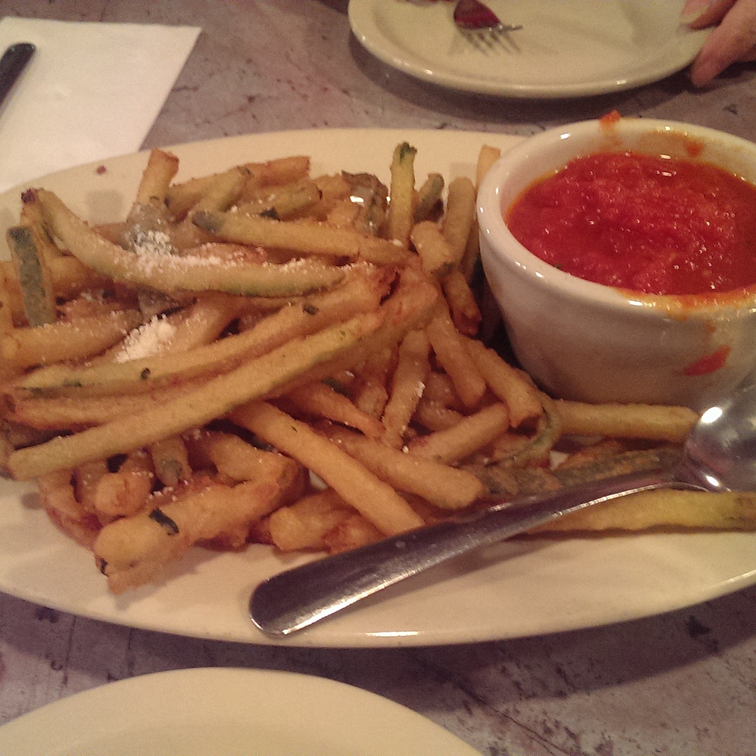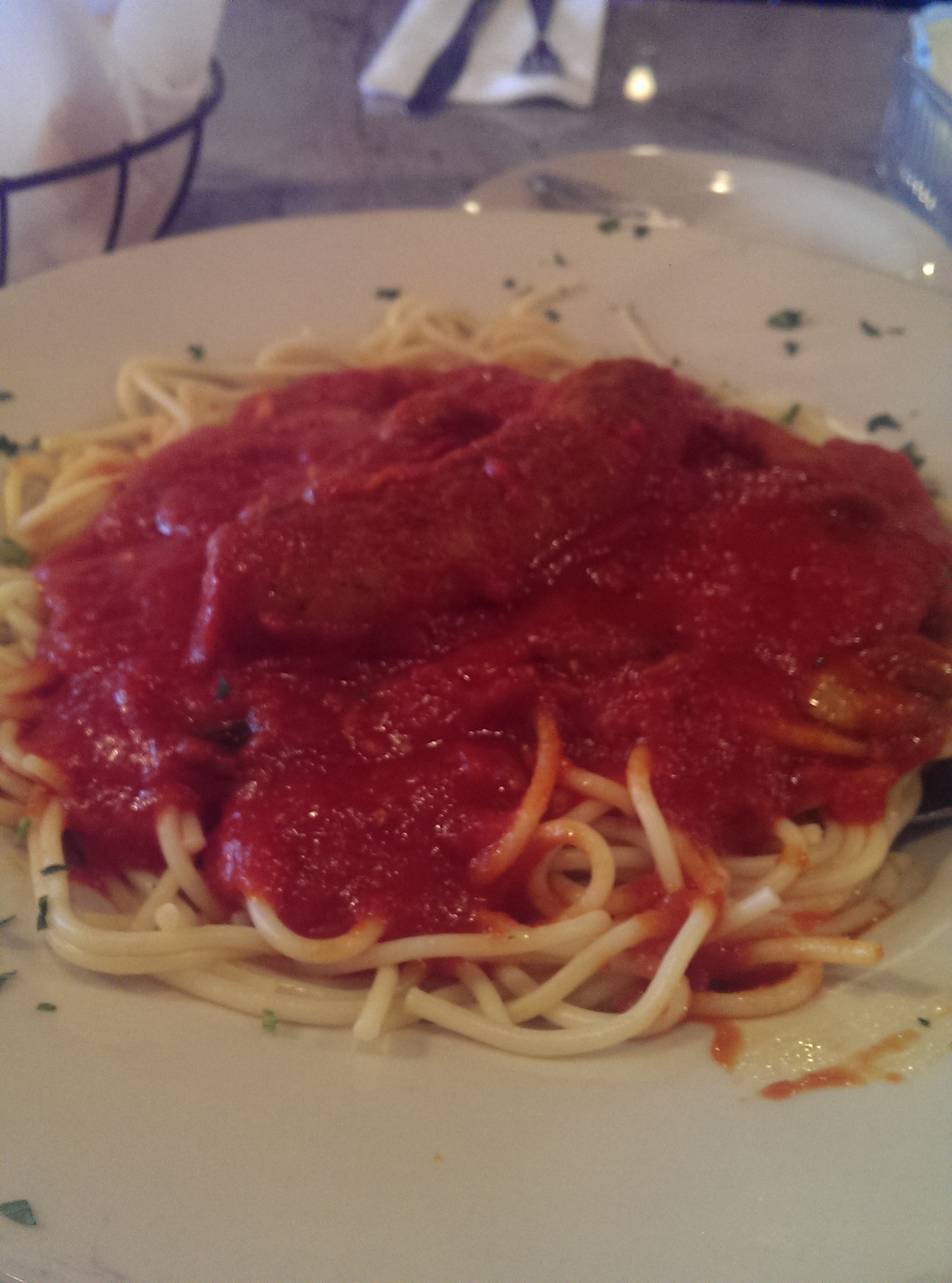 The heavenly smell as they were frying it permeated the restaurant (I was the only table left after their lunch rush), which made me really anticipate the meal. It was served with a side of spaghetti. I was able to upgrade it to the meat sauce for an extra dollar. I had been wanting spaghetti that day, but didn’t want a huge plate of it. This was perfect – and I was able to bring two of the three cutlets home for later.