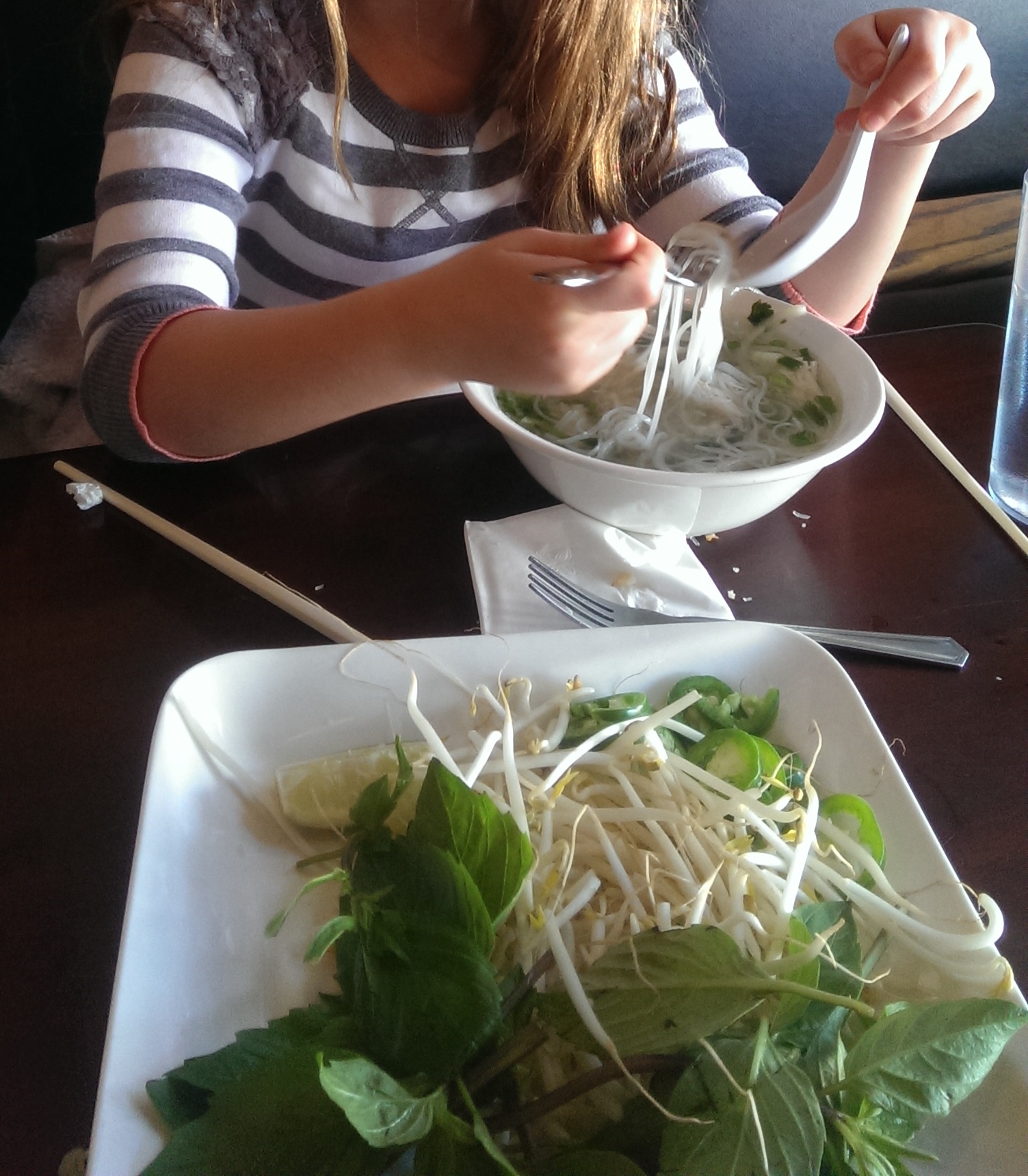time I went I ordered pho. I think it might have even been my first time trying pho. It’s good pho. The broth is a well-balanced bone broth with subtle flavors. They serve the usual meats – rare beef, meatballs, brisket, tendon, etc. The meat is always tender and melts in your mouth a bit. They serve lime here, which is a plus, in their side dish of add-ins (bean sprouts, Thai basil, lime, and jalapenos). I have also had the chicken pho (Pho Ga – pictured on the right), which is also good. It features a rich chicken broth and