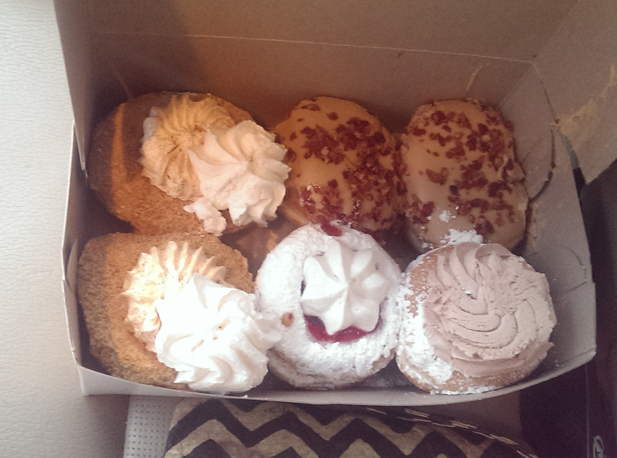 chocolate glazed, maple bacon and pumpkin pie doughnuts during my visits. The photo at the bottom features two pumpkin cream, two maple bacon, a strawberry cheesecake, and a chocolate cream. The maple bacon is a nice combination of salty and sweet with fresh bacon bits and maple frosting on a yeast donut. The chocolate cream exploded in a huge flurry of powdered sugar all over me and my car. I
