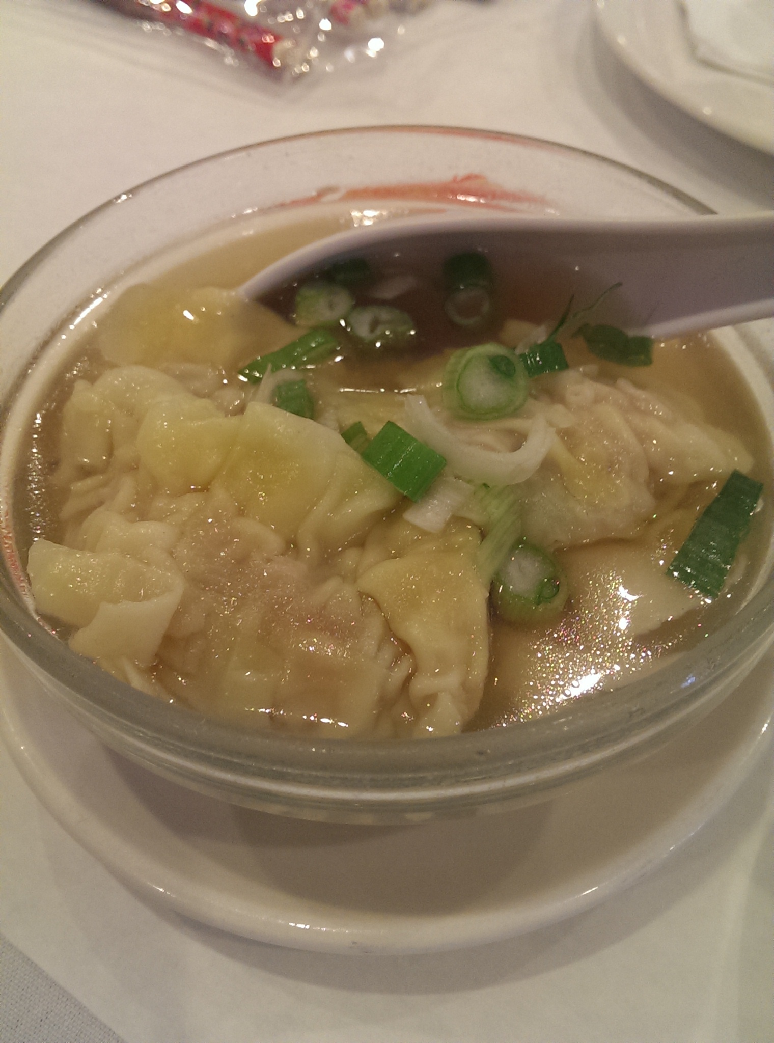On yet another round Nancy grabbed orders of steamed taro cakes and turnip cakes, which the server graciously divided in half for our table to share, as well as potstickers. The taro cakes were slightly overcooked and fell apart rather easily. The turnip cakes were good. They are a little creamier than the ones at Emperor’s Palace, which are my absolute favorites. I can’t say anything about the potstickers. I don’t think I ate one because I was just full.