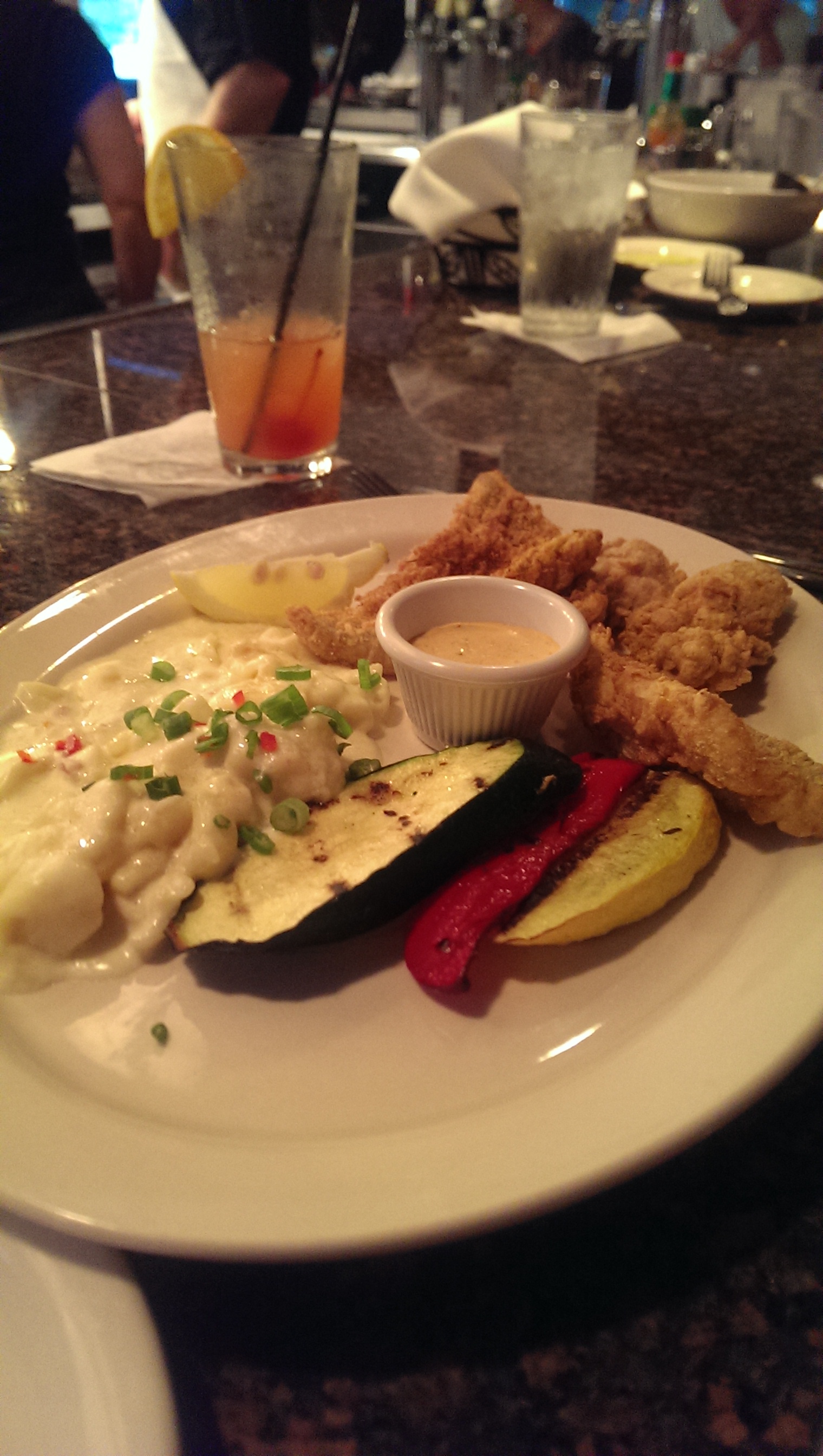 In fact, my friend enjoyed the meal so much she went back a week or so later and ordered a variation on the same meal, this time lake perch and scallops with smokey baked 3-cheese macaroni, grilled seasonal vegetables, and chipotle tartar sauce.