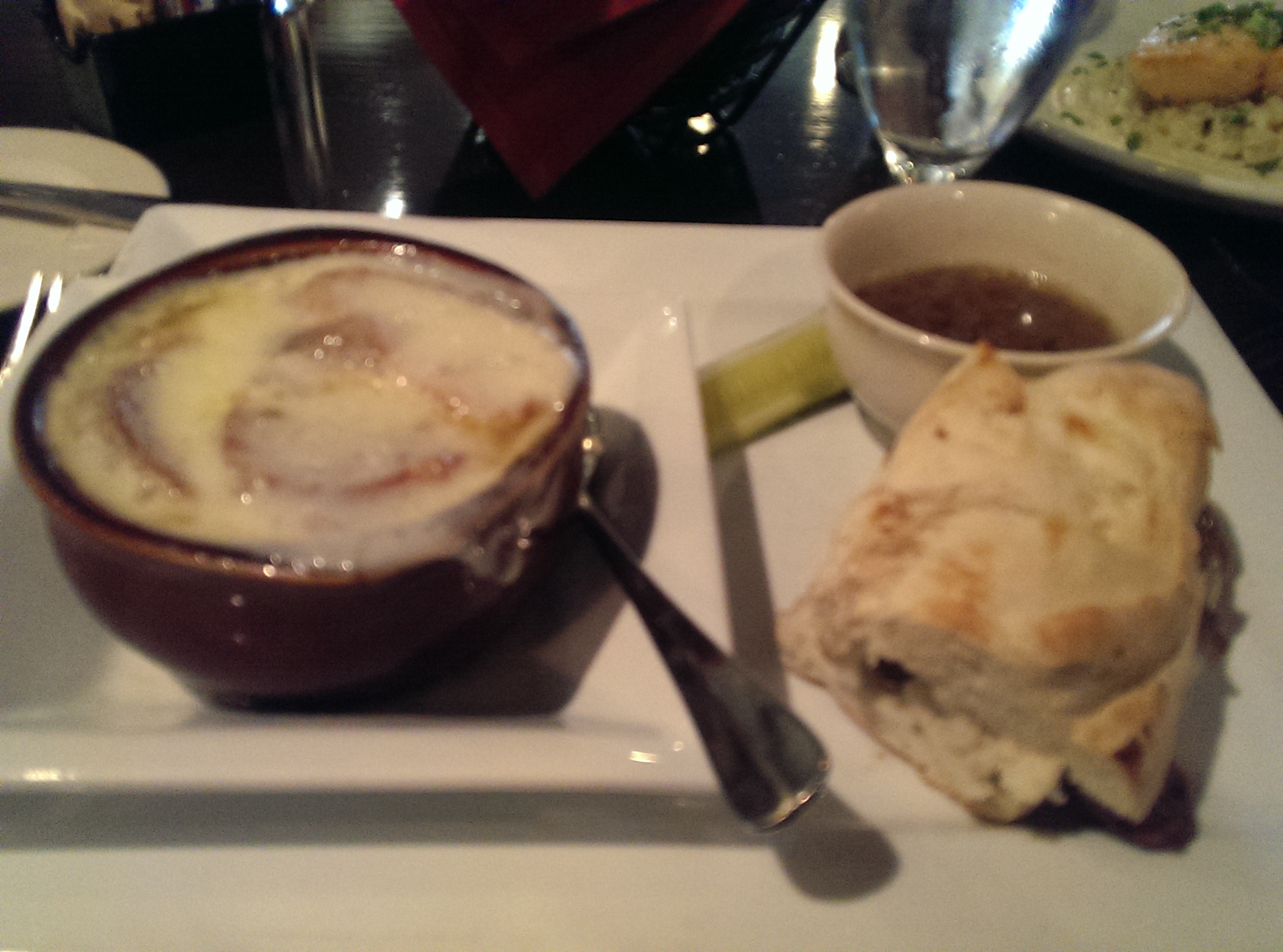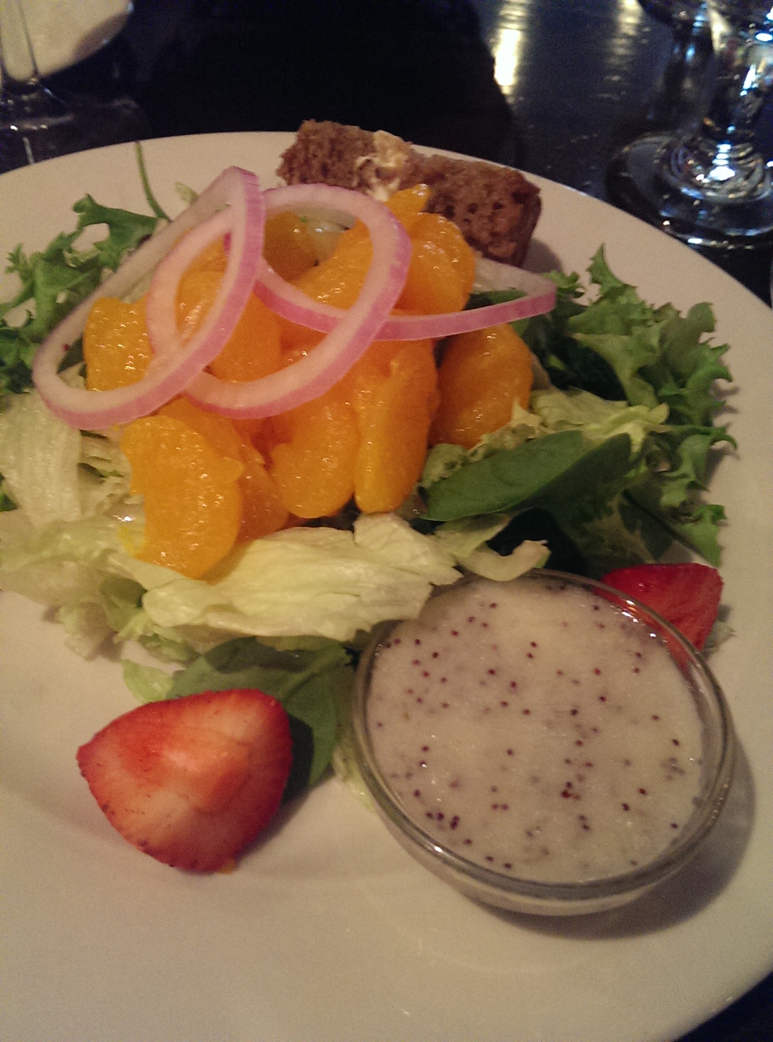 salad and a lunch duo of the French onion soup and the French dip (pardon the blurry photo). The house salad was fresh, and I enjoyed the poppy seed dressing paired with the fresh greens, mandarin oranges and strawberry slices. The French onion soup was suitably cheesy and was packed with lots of caramelized onions and two slices of dark bread. I was less wowed by the French dip. The “baguette” had a weird texture to it that kind of collapsed when it was dipped in the au jus. I would have preferred a proper