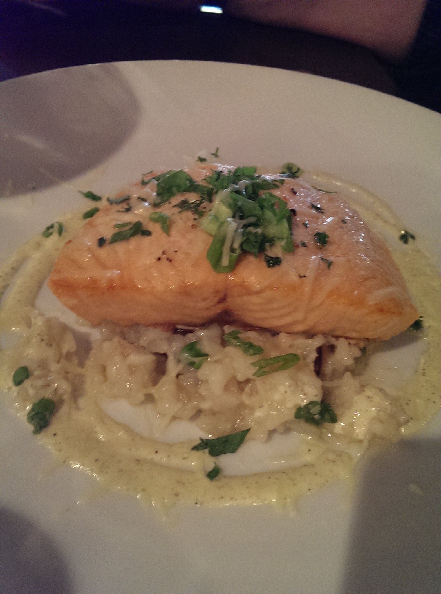 My dining companion ordered a house salad and the special baked salmon entree with a lemon thyme glaze served over spring pea, asparagus and Asiago risotto. He thoroughly enjoyed every bite, and I enjoyed the