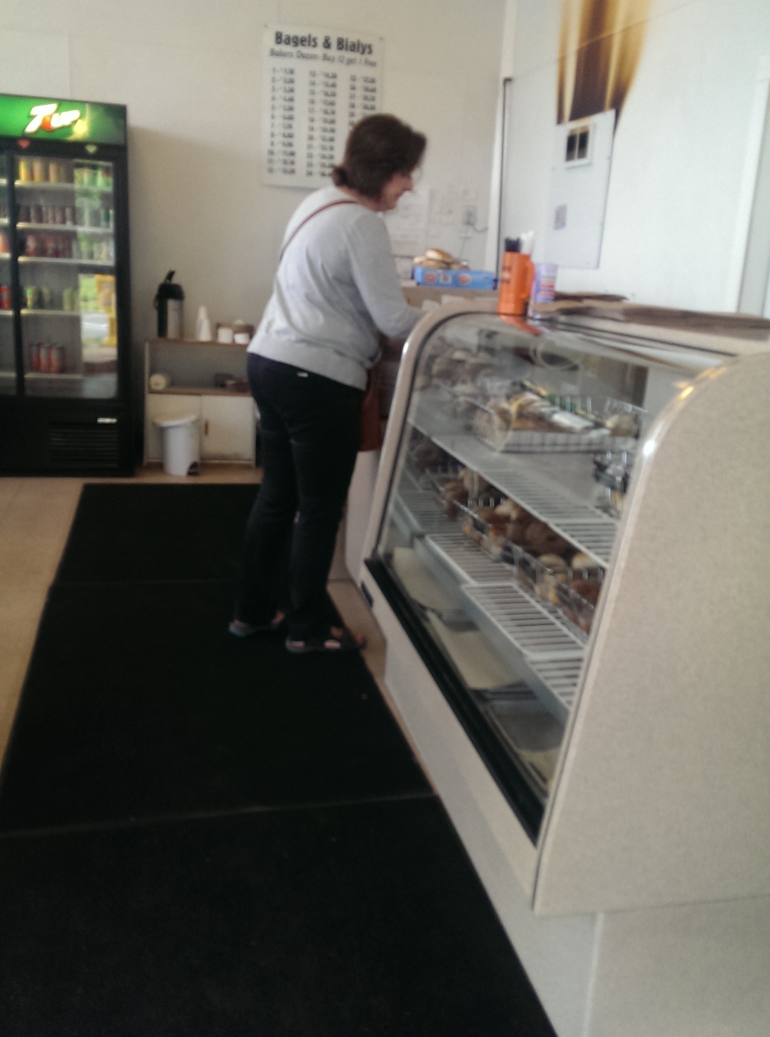 If you are wondering what the difference between a bialy and a bagel is, bialys are round with a depressed middle filled with cooked onions and sometimes poppy seeds and then baked. The outside of a bialy is therefore matte, not shiny. Bagels are boiled, then baked. The bialys are only available in onion, garlic, and mish mosh flavors. They also sell longer salt sticks, but I usually stick with my mish mosh and sesame seed bagels.
