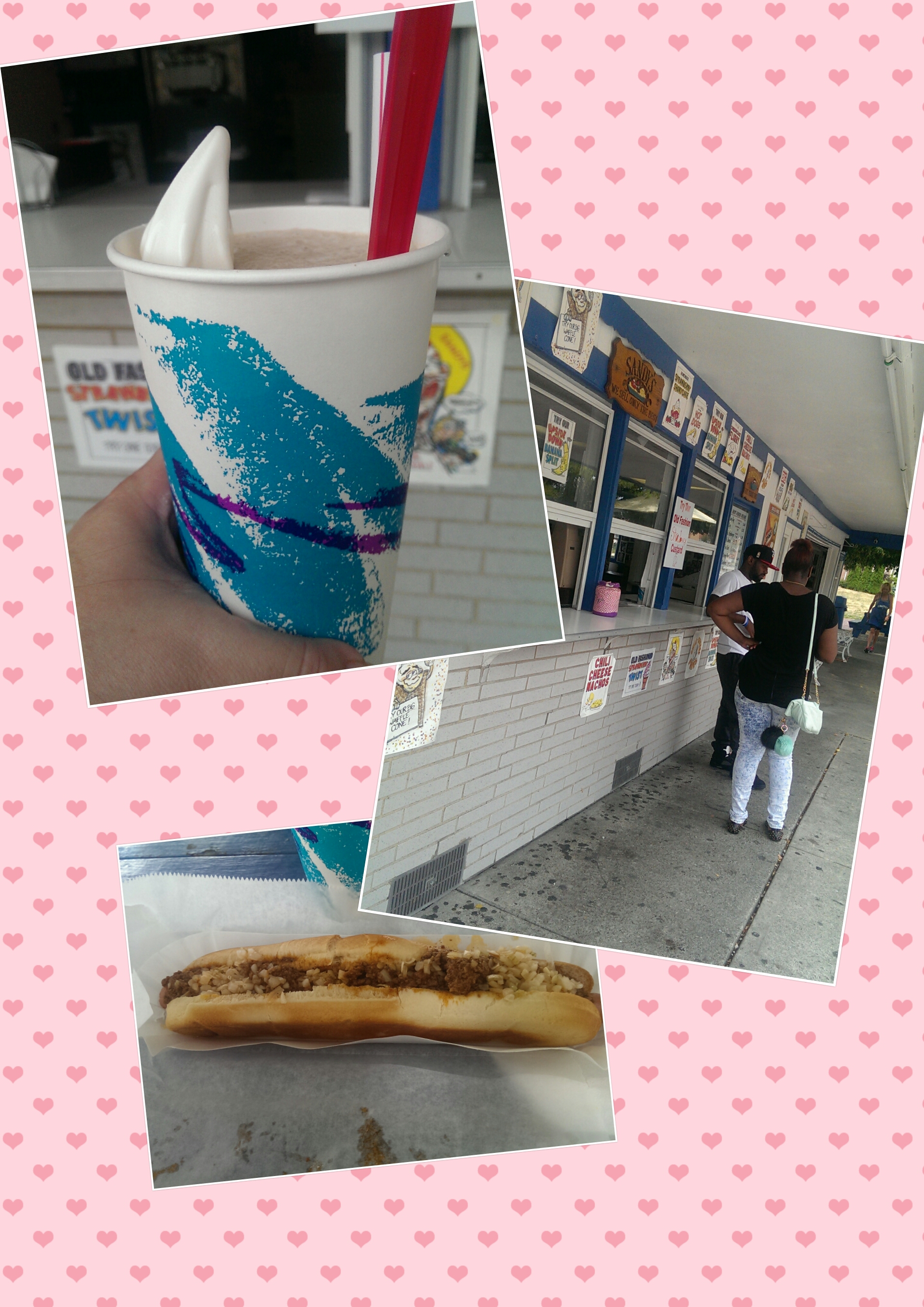 ordered. A root beer float and a foot-long chili dog with everything definitely brightened my day. The person working the counter (I think it might have been Sandy herself) was extremely friendly and helpful. She made a strawberry shortcake sundae while I was waiting for my chili dog that looked tempting for next time (sub ice cream for whipped cream on top).