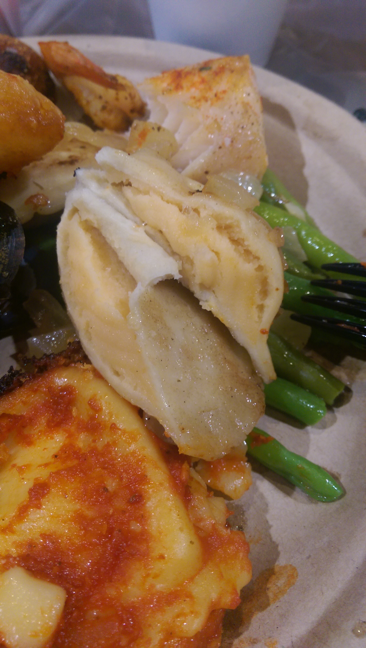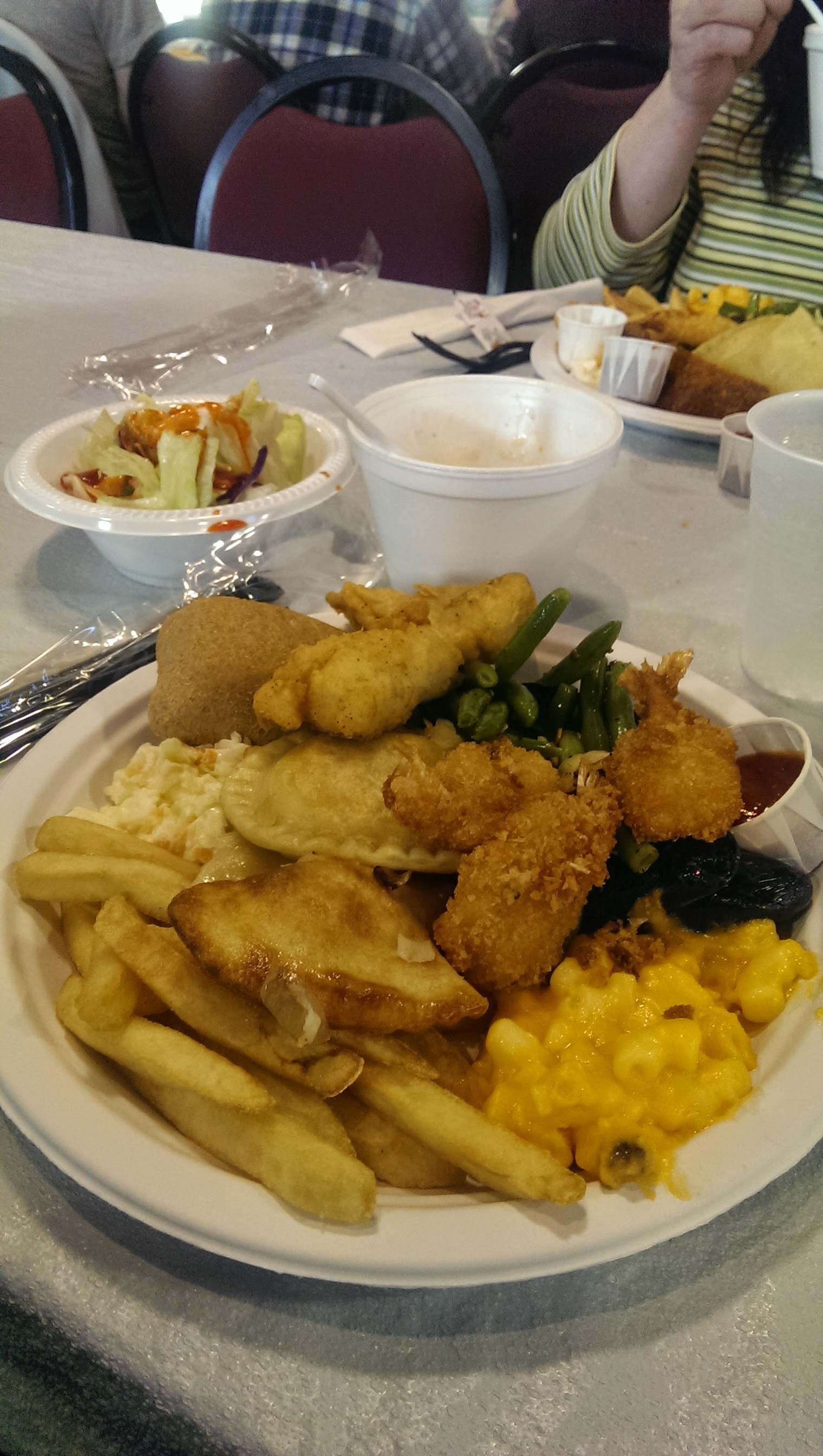 seafood chowder that ran out just as I got there. I tried to keep an eye out for when it came back out, but they ran out of it fairly early. They always do. There was a small table in the corner with tartar sauce and cocktail sauce. They ran out of tartar sauce several times. Beverages were along another wall, including tea and coffee and unsweetened ice tea, lemonade or ice water. Dessert (on the same table as the beverages) was chocolate or white cake, which ran out by the time I went back for some. Grab it when you can! They eventually brought out a tray of brownies, which were excellent, and when that ran out they brought out orange slices right at the end. I don’t know who makes the food, but every single item is great.