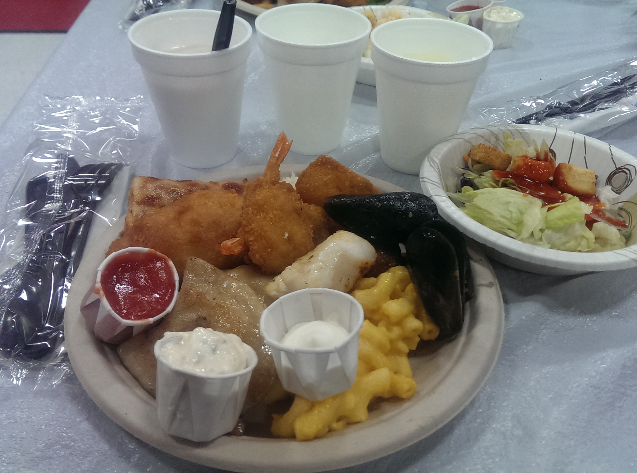 There is a lot of food to choose from, so I was extra judicious this year. I eschewed most of the carbs and saved room for the fish and mussels. Let me see if I can remember everything on offer… starting with salad, cole slaw, applesauce and rolls and butter (which I somehow overlooked), then moving on there were baked potatoes, french fries, mac n cheese, cheese ravioli, fresh green beans in butter, pizza (always popular with the kids), hush puppies, and cheese pierogi, fish choices included baked tilapia, fried cod, baked cod, butter crumb baked cod, mussels, breaded cocktail shrimp and peel-and-eat shrimp and at the end was a pot of