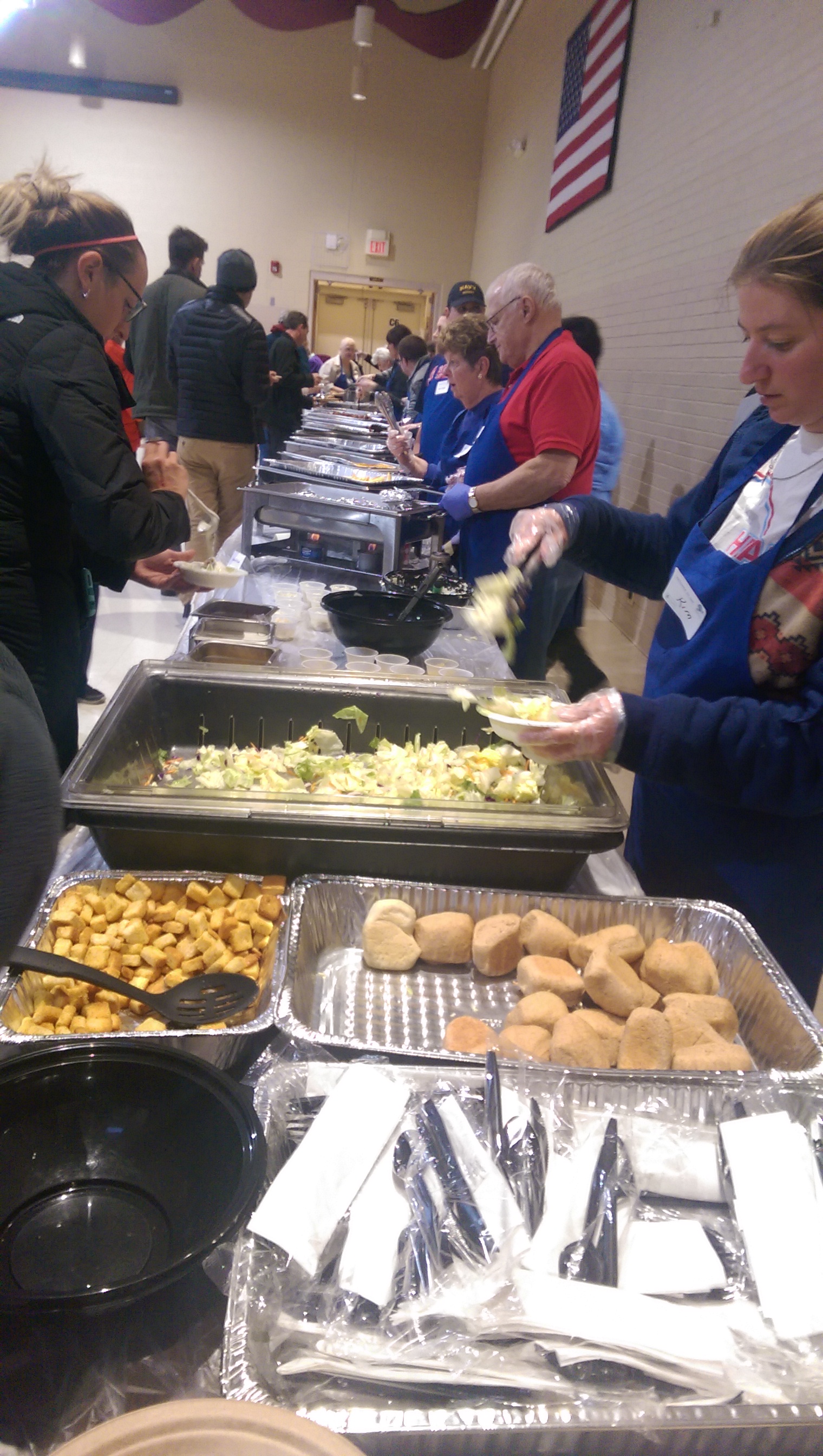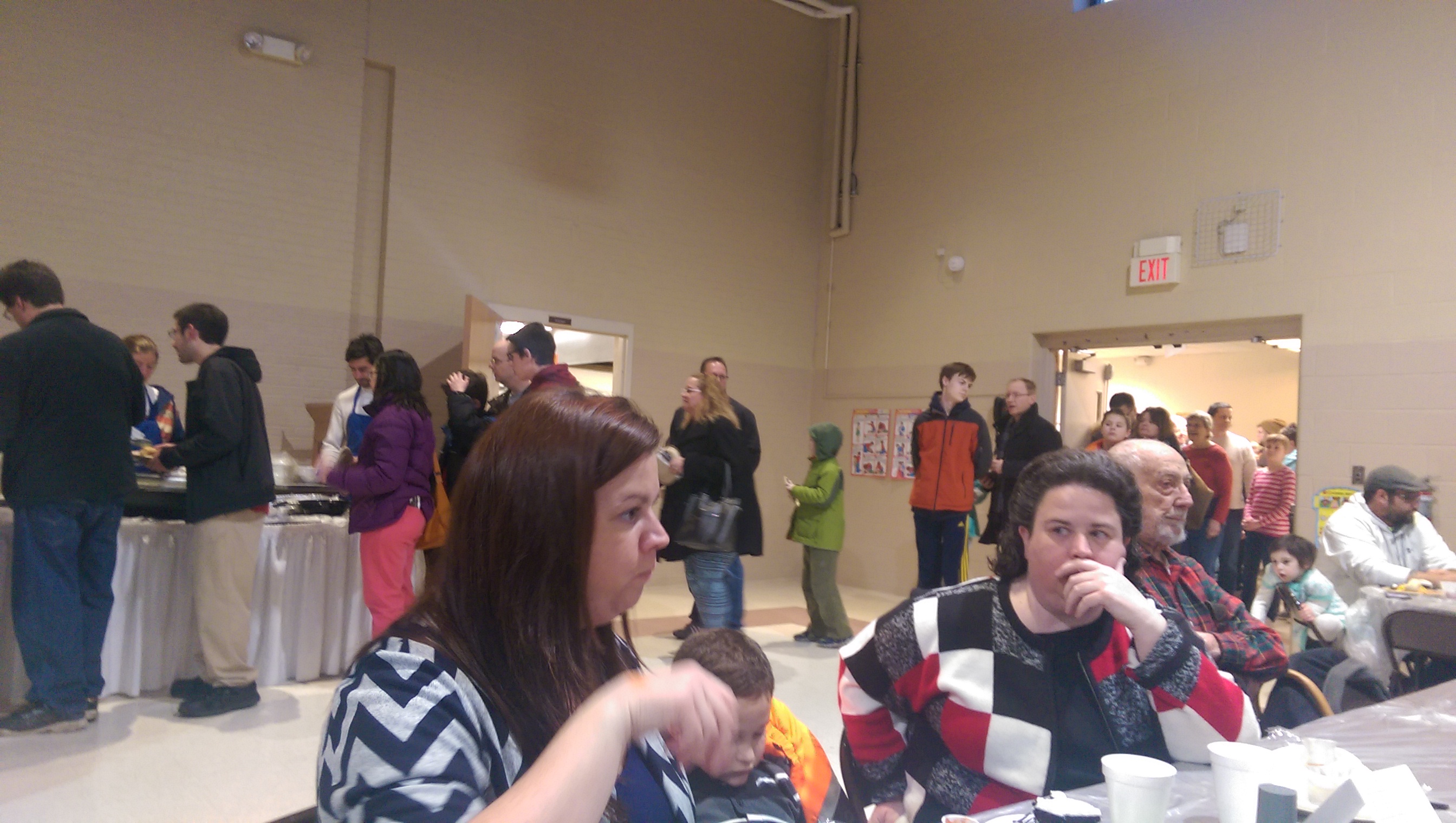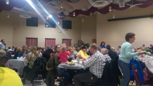 church website. There are two dining rooms – the main dining room has a shorter line between the cash table and the food, so we chose that one this year. We got there at 6 PM and were in line for about 20 minutes until we were sitting down with our plates. I needed to save six seats, so I jumped out of line to reserve them right after six together cleared and were cleaned off. The gymnasium has no line for the cash table, but the line for the food circles the room. We waited in line for 45 minutes last year. There is more seating, but also more people.