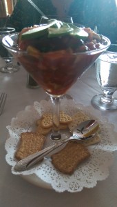 The Camarones a la Cancun (shrimp cocktail with avocado, cilantro and onion in a tomato sauce) was a little sweeter than I expected, but I enjoyed it. I wish it had come with a few more crackers, because I was left with a lot of tomato sauce left over once I ate the shrimp and avocado out of it. If you plan on ordering this save one or two pieces of bread.