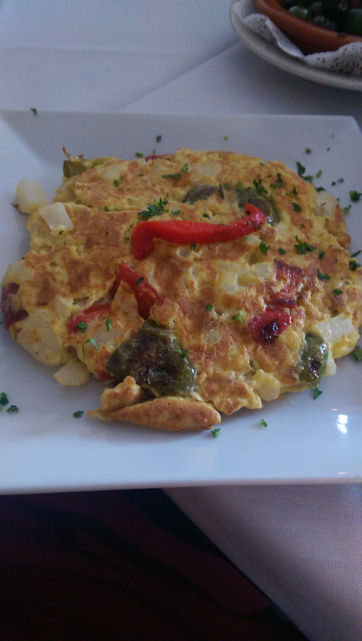The more I examined the menu beforehand, I decided to eat my way through the tapas menu instead of ordering the paella. Everyone at the table ordered tapas that night, and we passed the dishes around and got to taste everyone’s choices. I went in determined to order the Spanish tortilla, which is a simple omelet of eggs, onion and potatoes, and a couple other small plates.