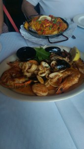 Our waiter was noticeably overwhelmed, and I’m sure the kitchen was as well. He forgot to mention a couple of specials that one of our fellow diners would have ordered if she had known about it. We had already ordered when he approached a neighboring table and told them the specials, including the missing ones. The photo below is the Seafood Special, featuring langostino, scallops, clams, calamari and mussels. Three of my dining companions split this as well as a couple other small plates and enjoyed it. The entree in the rear of the photo is the Fideuà, which is similar to paella but made with noodles instead of rice.