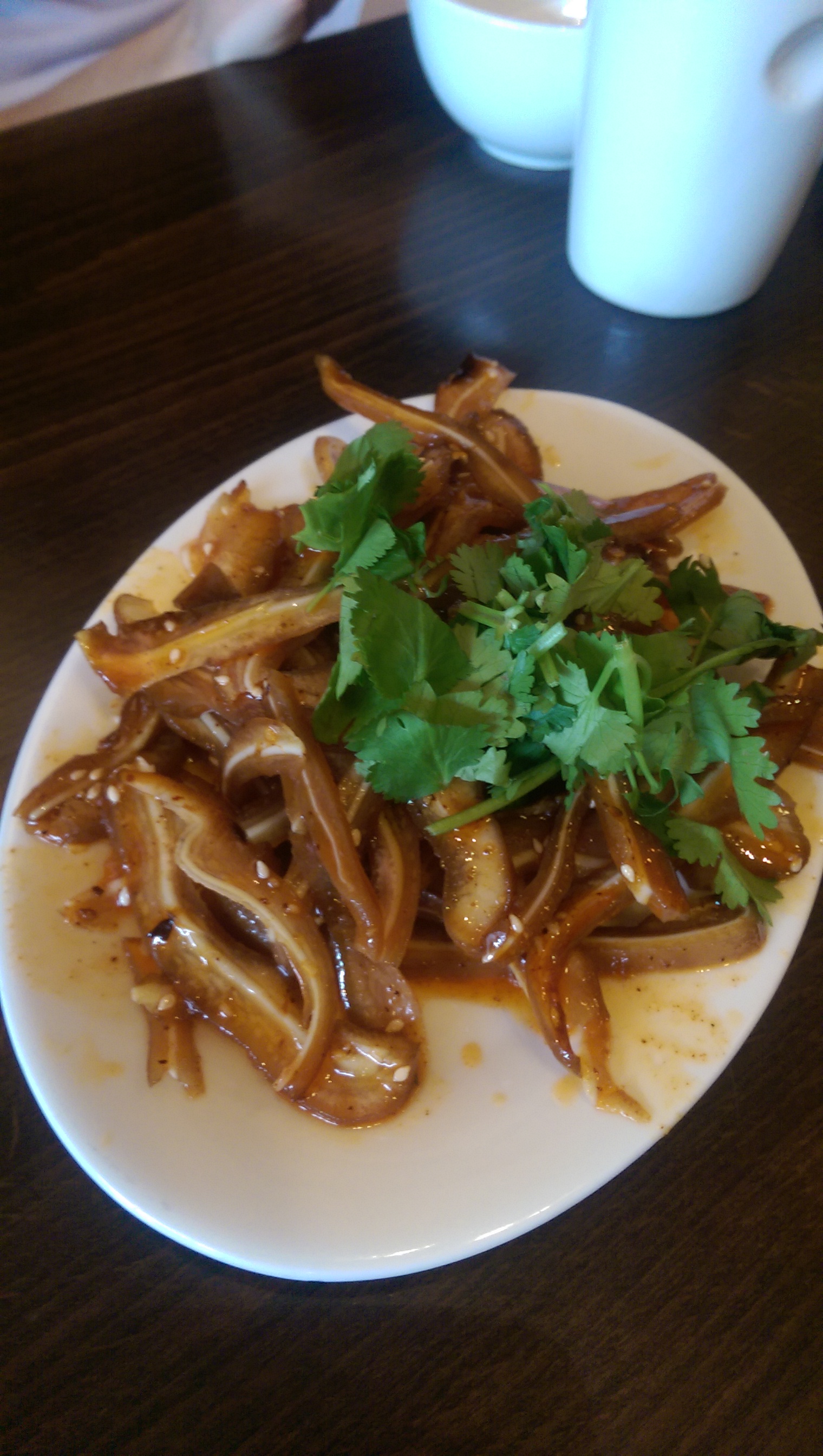 I have become a big fan of smashed Chinese cucumbers in the past year or so. This version is more cucumbery than others I have had, with minced garlic clearly visible. The photo shows them with chili sauce, but that wasn’t the case. The cucumbers were fresh, crisp and very lightly pickled, and a nice, refreshing counter to the dumplings and noodles, but I find I prefer