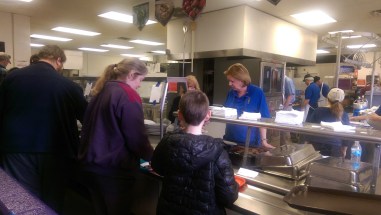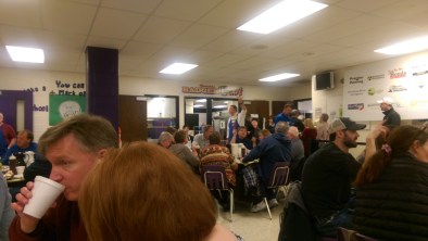while I parked down and across the street from the high school lot, which was jam-packed with cars. I drove through the entire lot and not a single spot was free. I had an inkling this would not be a quick breakfast like the last two pancake breakfasts were. We queued up once we walked in and wound our way up the stairs and through the hallways of the school. They had pins for the visitors to mark where they came from. There was a board for Geauga County residents as well as one of Ohio. One pin was from Toledo, while several others were from Pennsylvania.