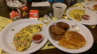 cardboard piece with a number (#1 for Western, #2 for ham and cheese, and #3 for veggie – peppers, onion, mushrooms and cheese) and handed the print-out to the person at the door to the cafeteria serving area. We wound our way through that area, grabbing a tray and silverware and collecting our pancakes and sausage patties, choice of milk (regular or chocolate) and orange juice. They then assigned us a table and whisked away our trays before we even had a chance to sit down. The omelets were quickly brought to our tables, and we handed them the colored cardboard.