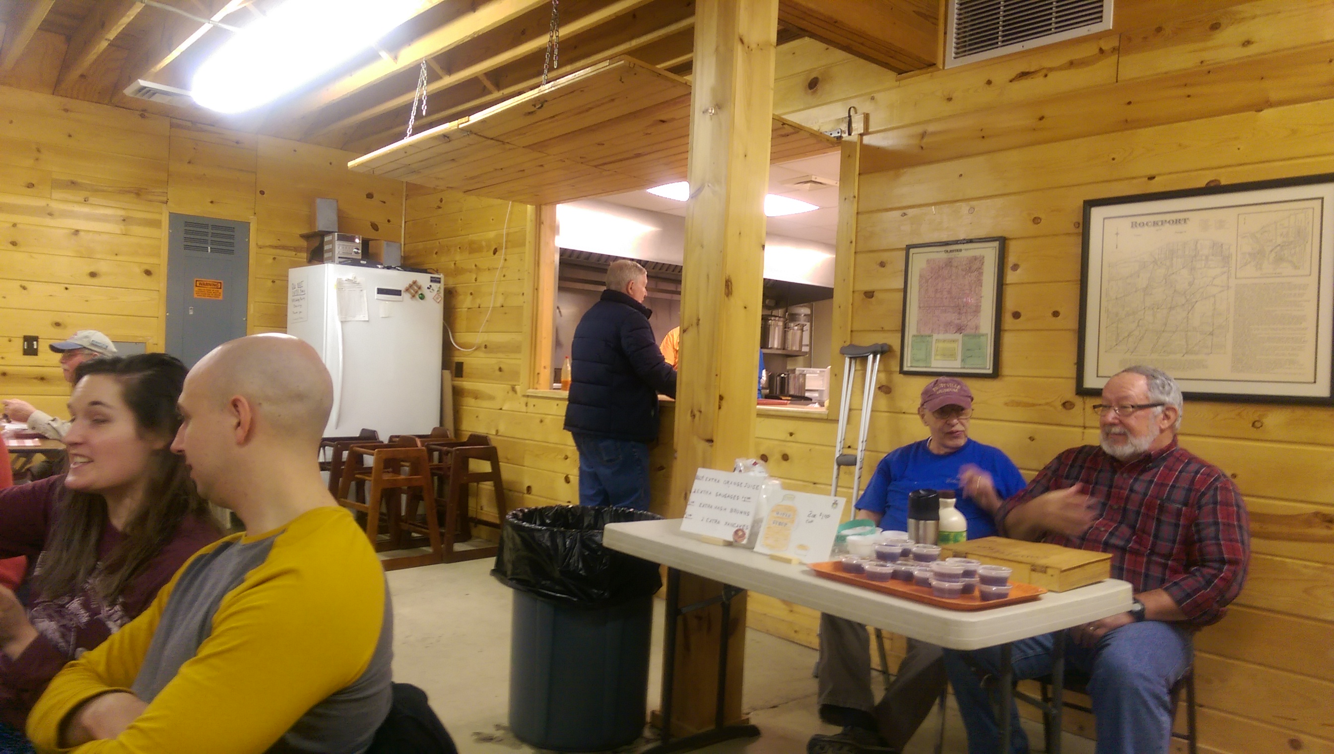 Menu 1 includes unlimited pancakes, juice, hot beverage and sausage. Menu 2 includes scrambled eggs, sausage, potatoes (no refills), juice & hot beverage. Additional sausage is 3 for $1.00, additional orange juice is $.50. Maple syrup was also extra. Syrup was on the tables, but the maple syrup was doled out in little portion cups. I upgraded to add scrambled eggs to Menu 1 and bought an extra orange juice, so I spent $10.50. The coffee was at a table in the back of the room (see above photo).