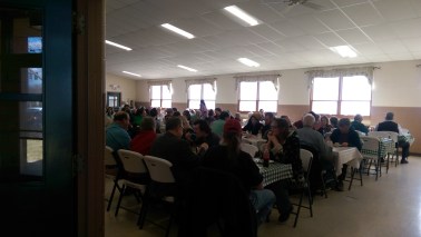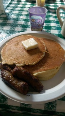 I opted for a combo stack of pancakes – a mix of two regular pancakes and one buckwheat pancake – and it came with three sausage links. The pancakes and sausage were delicious. I liked the regular pancakes a bit more, but the buckwheat ones were definitely great. There are people walking around the room refilling coffee cups and doling out more pancakes and sausage. I had one more of each. There are big pitchers of maple syrup and sticks of butter on the table to help yourself.