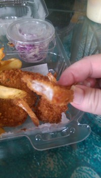 anticipated a good meal. I was not disappointed. The shrimp were pounded a little thinner than I like, but they were still moist with a crunchy exterior. There was a slice of lemon hidden under the fries, which I squeezed over the shrimp to give it a light, bright lemon flavor. The fries had a nice light seasoning to them, and the slaw was good. I didn’t come for the