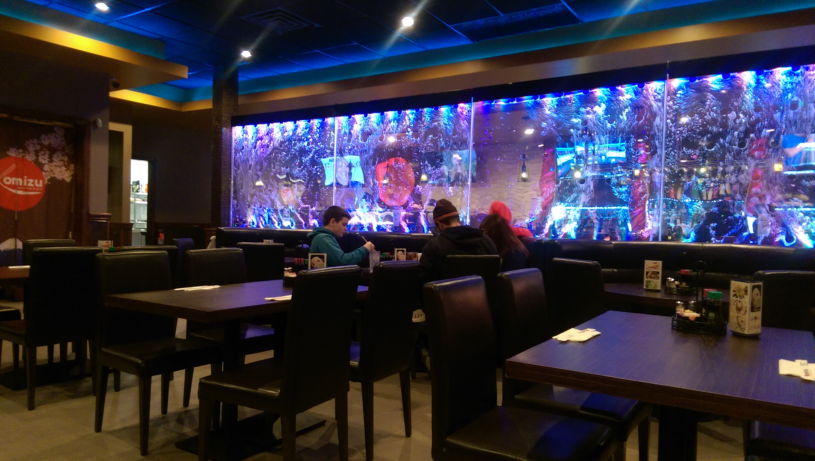 I stumbled on it when I was looking for a place close to the Parma-Snow library to grab a bite after an author book talk and signing. I love the wall of water and fake fish that divides the