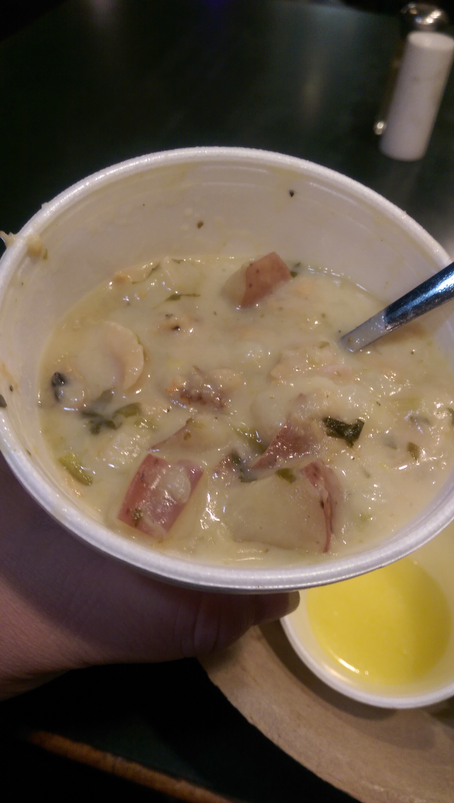 A must for me is Sokolowski’s clam bake in October. Every Saturday in October from 4-9 they serve a clam bake with either a 1/2 chicken or 12 oz strip steak as well as a ton of other really tempting menu choices. Since it was a spontaneous decision and I hadn’t preordered I was afraid they would run out by the time I made it to the counter because the line was long (it started outside the back door and threaded its way through the dining room), but luckily they had one. (Plan B would have been to just cobble something together from the chowder, appetizer order of clams, and a kielbasa meal.) Their New England Clam Chowder was my favorite part of the meal this year. It was creamy and delicious with lots of chopped clams and big chunks of bacon. The red-skin potatoes were creamy and perfectly cooked as well. I need to get back here to enjoy the chowder again soon. I hope they don’t just serve this during the clam bake season. But I have to mention that normally I ignore the clam broth at clam bakes. I am so glad I didn’t ignore the clam broth here. It was buttery and flavorful, and it was my second favorite part of the meal – and that’s saying something since I ordered a strip steak and clams!